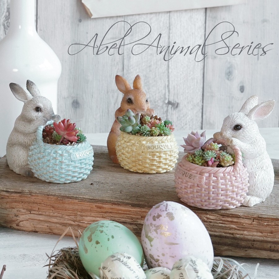 小さなバスケットを抱えたうさぎたちが愛らしいレジン製の鉢。
