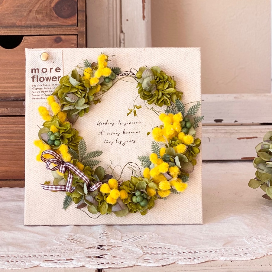 リースベースがプリントされているキャンバスボードを使ったアレンジです。