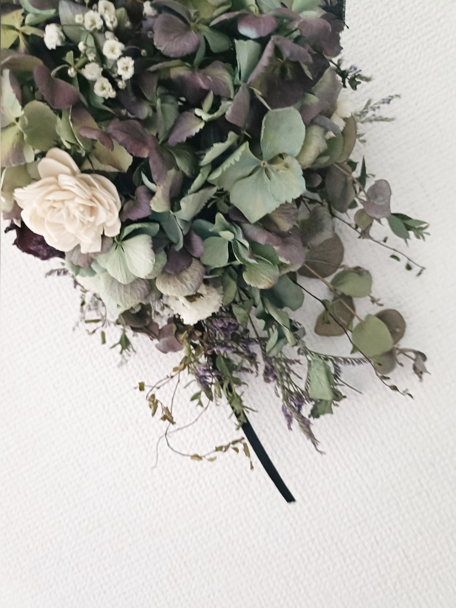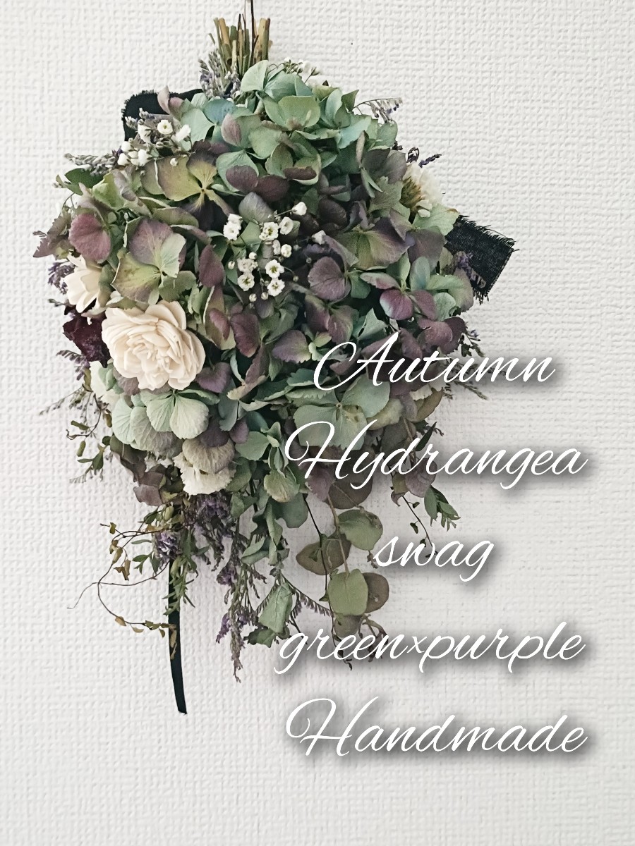 かすみ草も添えて、ちょっぴり可愛らしさも兼ね備えた人気の紫陽花スワッグです(ꈍᴗꈍ)