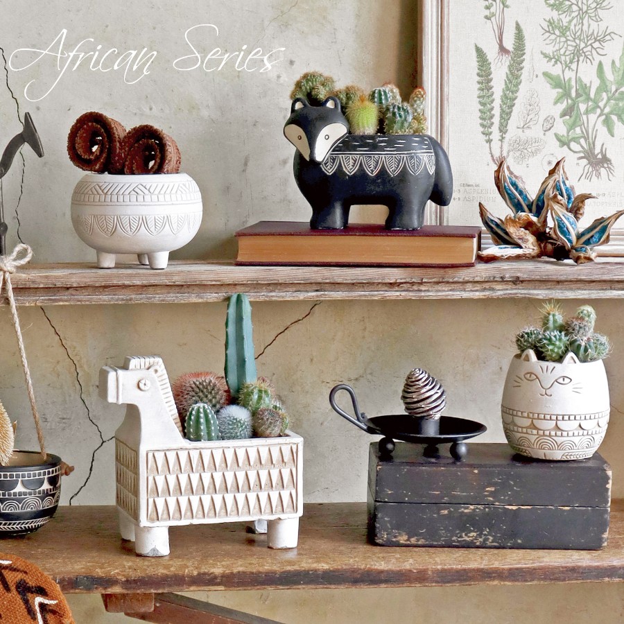可愛い動物のオブジェをはじめ、アフリカンやエスニック系のかっこいい系、アラベスク柄やダマスク柄といったエレガント系のものまで、どなたでもお取り扱いいただけるように幅広いジャンルのデザインの鉢を数多く企画開発しております。