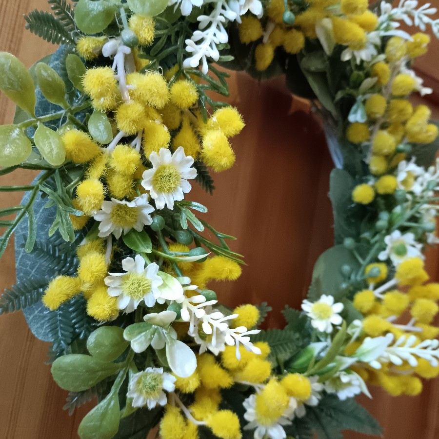 アーティフィシャルフラワーのミモザ、カモミール、ユーカリ、グリーン等で春色ビタミンカラーのリースを作成しました。