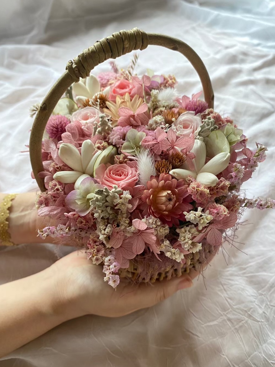 やわらかな色合いのかわいらしいバスケットアレンジです。