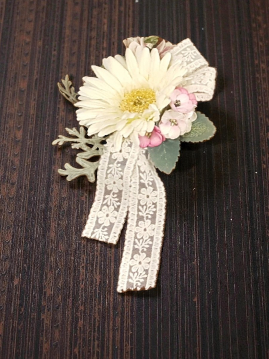 「レースを入れて可愛らしく」とのオーダーでしたので、レースリボンと明るい印象のガーベラで華やかに、可愛らしくまとめました。