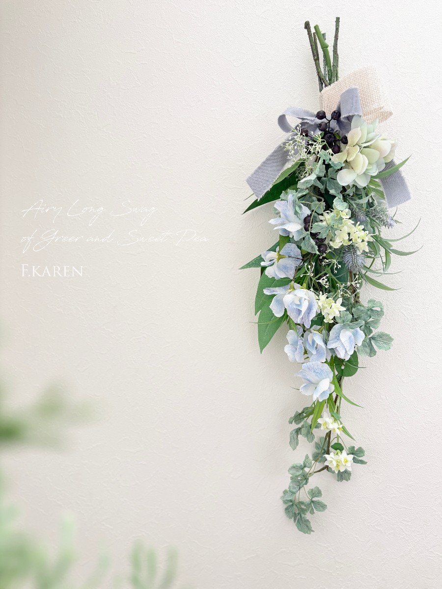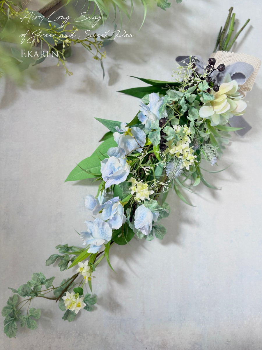 スイートピーと紫陽花、グリーンで軽やかに束ねました。