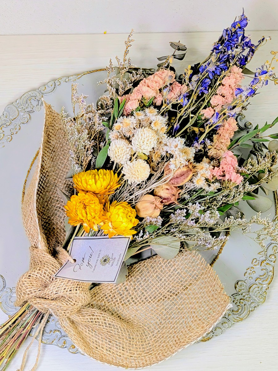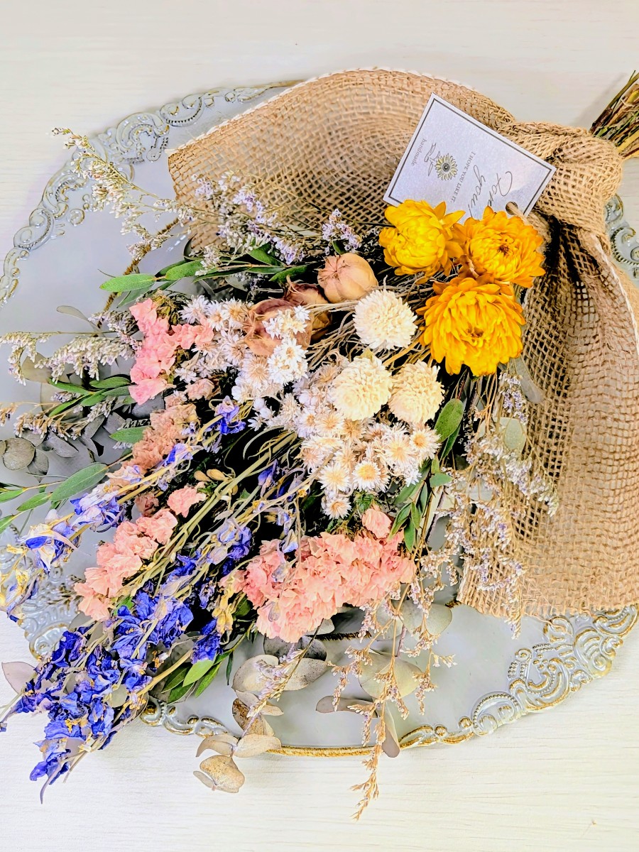 デルフィニウムの春待ちドライフラワーナチュラルスワッグです。ヘリクリサムや千日紅、スターチスなど沢山のナチュラル素材を使用しました。