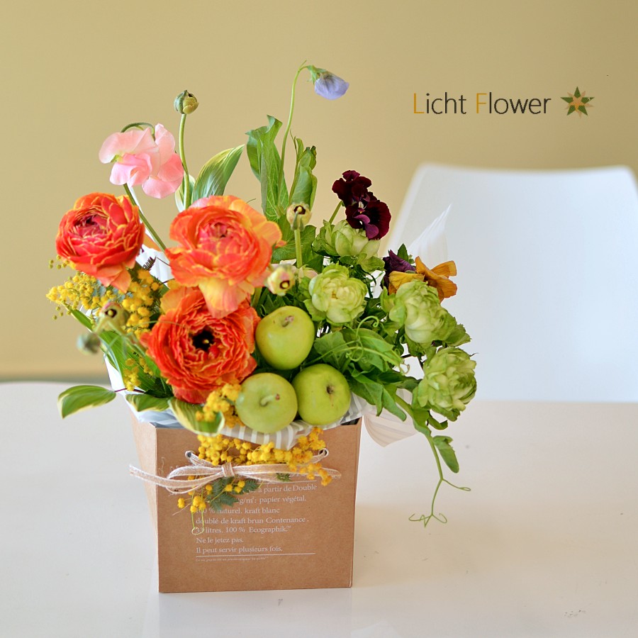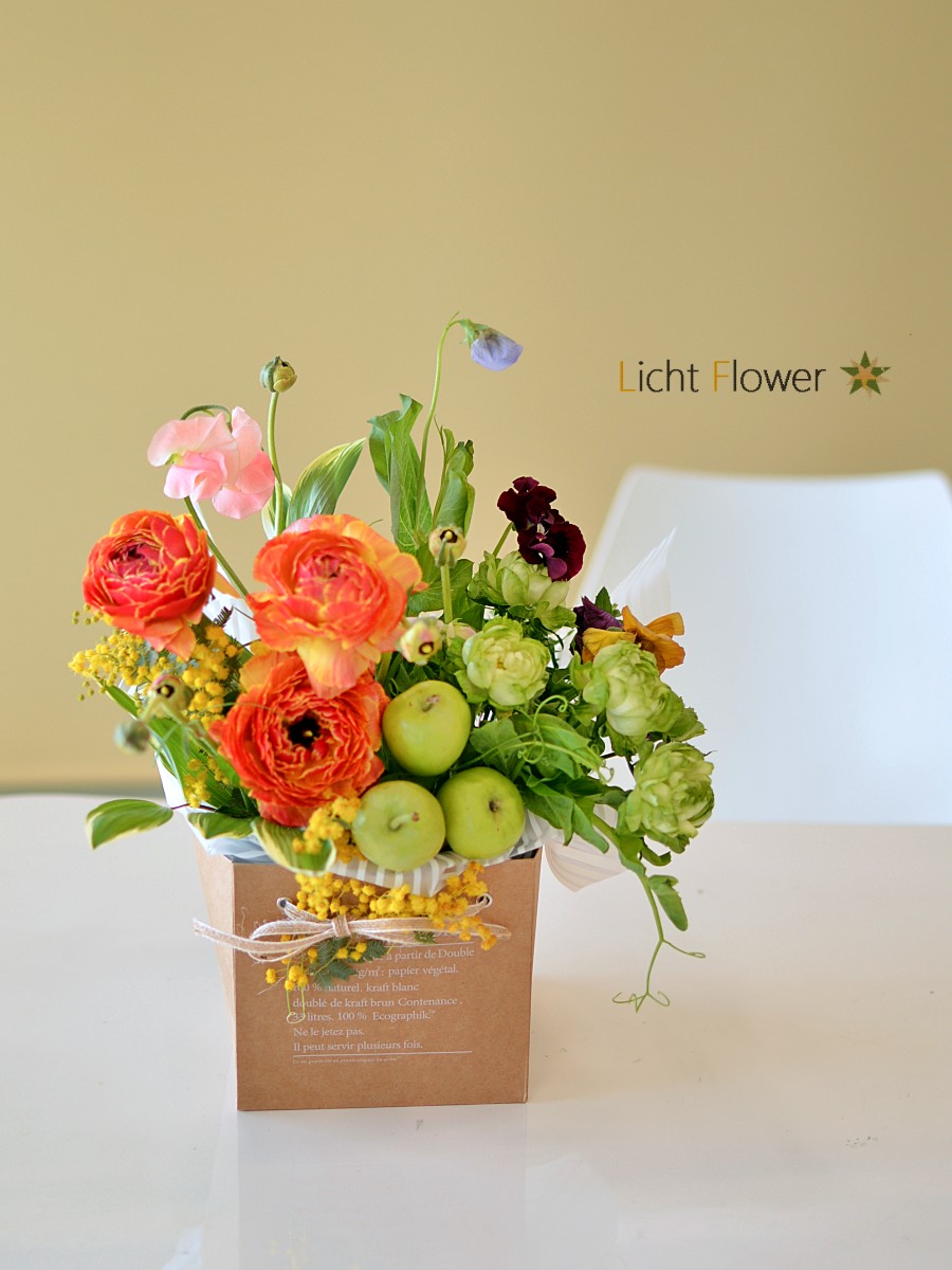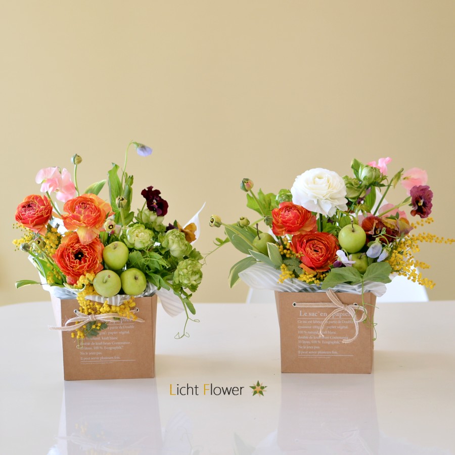 バックからこぼれるように春の花々をアレンジ
