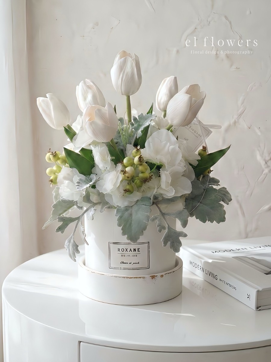 ふんわりとほころぶ白いチューリップに、ひらひらと蝶が舞うようなスイートピーを合わせ、シャビーな木製のハットボックスにたっぷりとあしらいました。