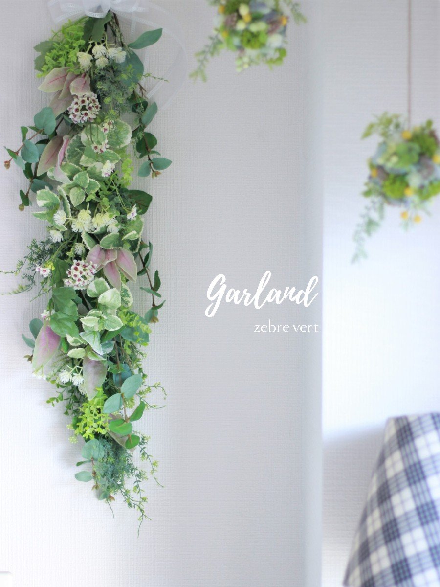 ほんのりピンクと新緑カラーの春から夏にかけてにぴったりなガーランド。つけるリボンで印象が変わります。