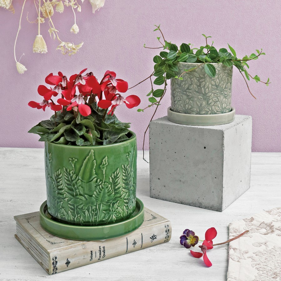 立体感のあるボタニカル柄がおしゃれなセラミック製の鉢。