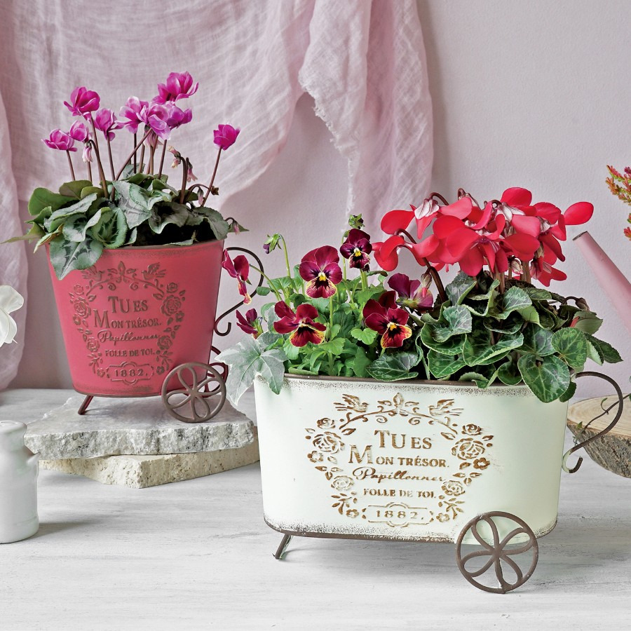 やさしい色合いとアンティーク風のロゴが上品なブリキ製の鉢。