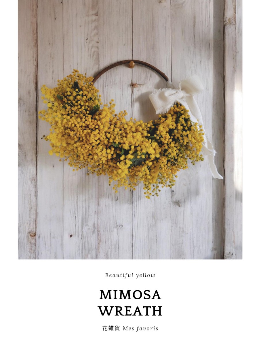シンプルにミモザだけを使って仕上げた、花かご風のリースです。