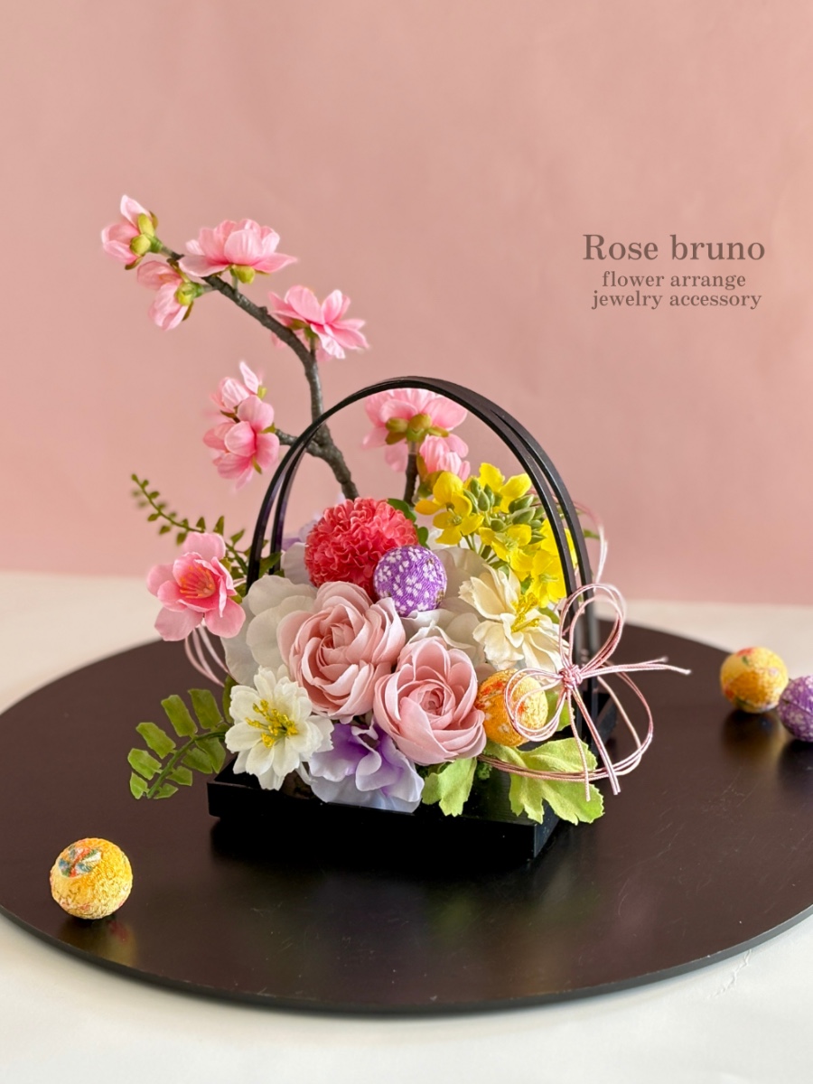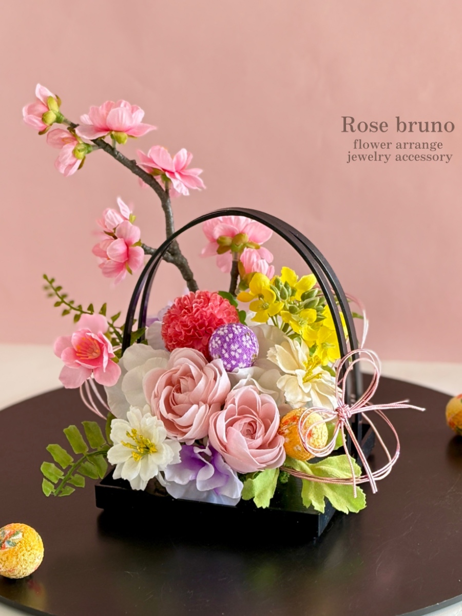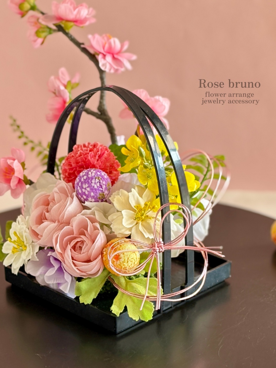 桃の花を主役に色とりどりの可愛い花々でまとめ、縁起の良い叶結びの水引やオリジナルちりめんボールをプラスして華やかに仕上げております✧◝(⁰▿⁰)◜✧