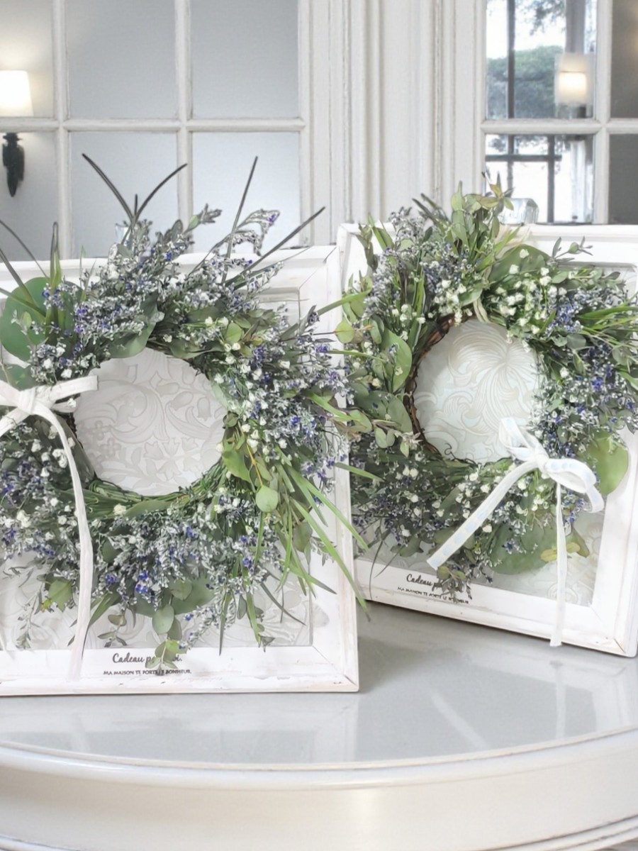丸葉ユーカリにブルーファンタジーとかすみ草を重ねたリースを作りました。