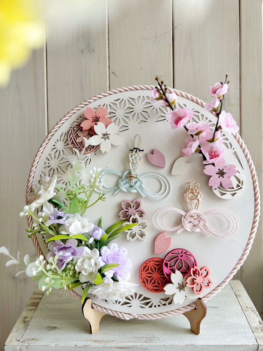 お花や木製パーツを組み合わせ、プレートですが立体感も出しました。