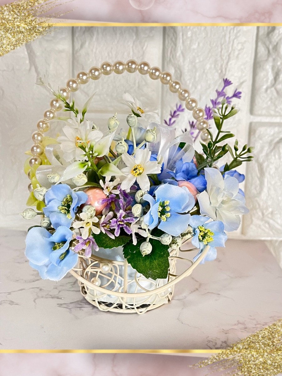 コンパクトで涼しげなお花。ブルーを基調に優しく仕上げております