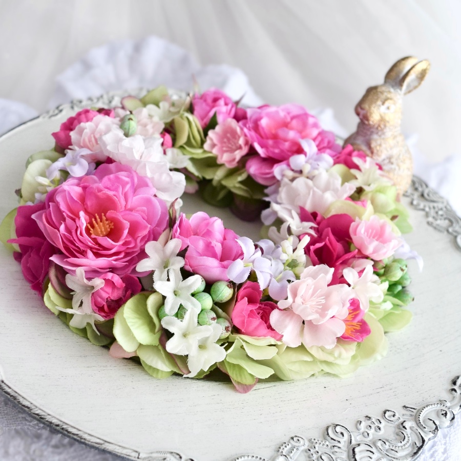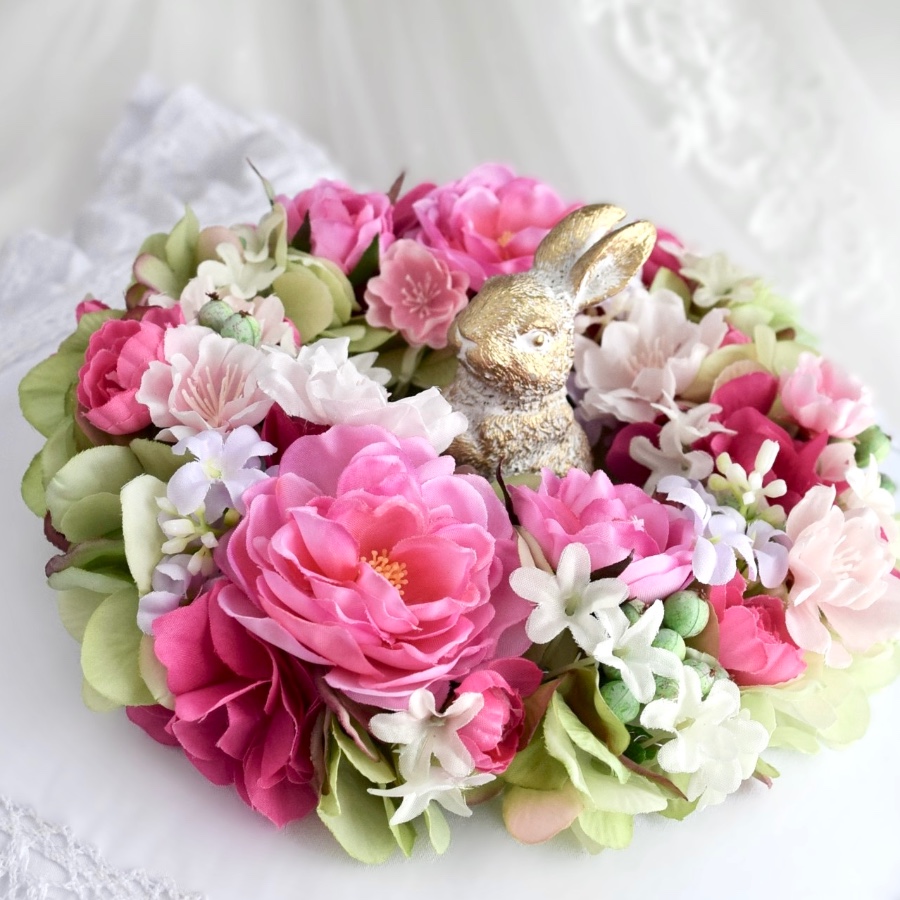 リースの中央や周りにウサギを置いてよりキュートに…。