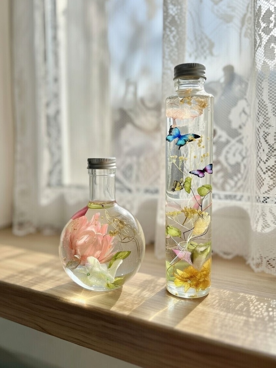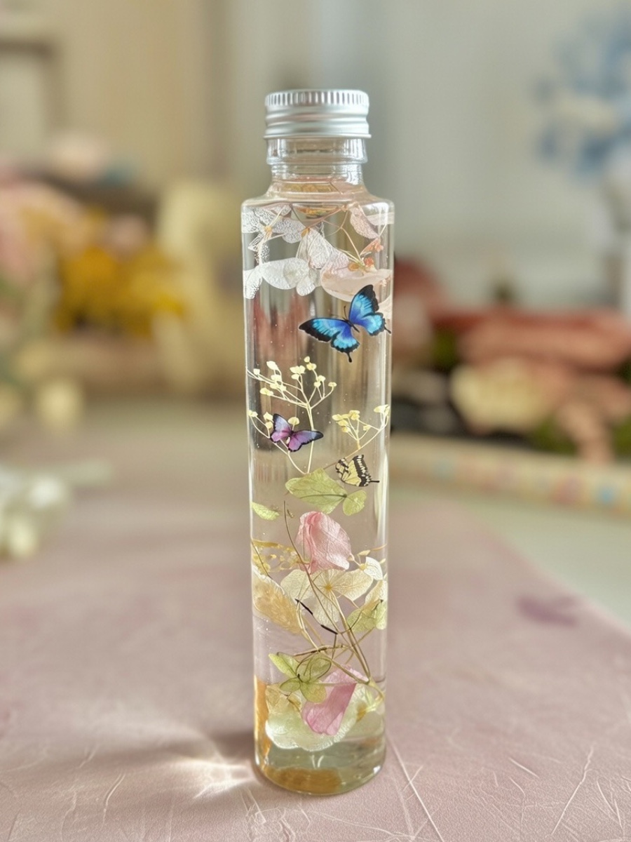 円柱瓶の上方にはピンク系のプリザーブドフラワーを入れて桜木の下を舞う蝶々を表現しました。