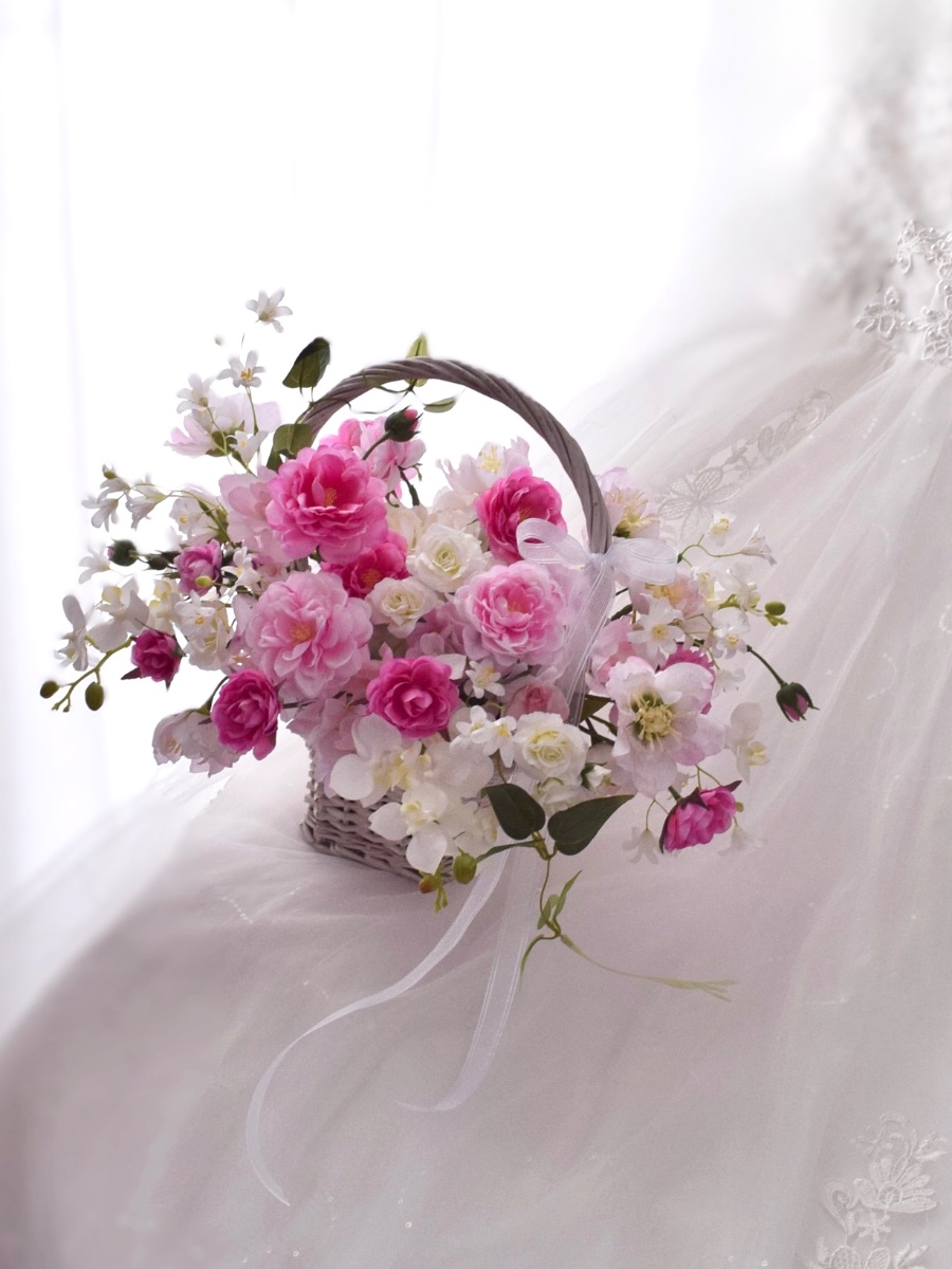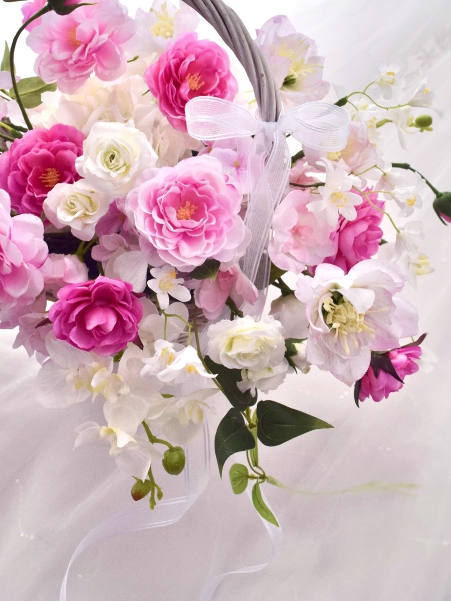 ピンクからホワイトへのグラデーションのロマンティックなバスケットブーケです。