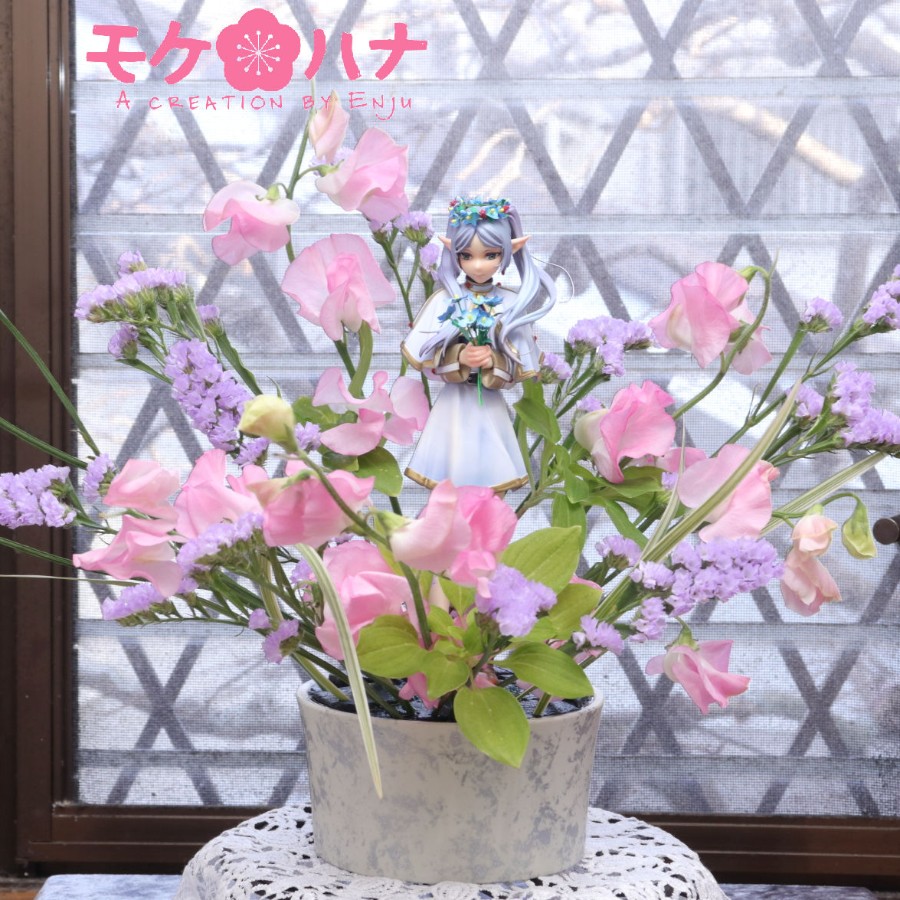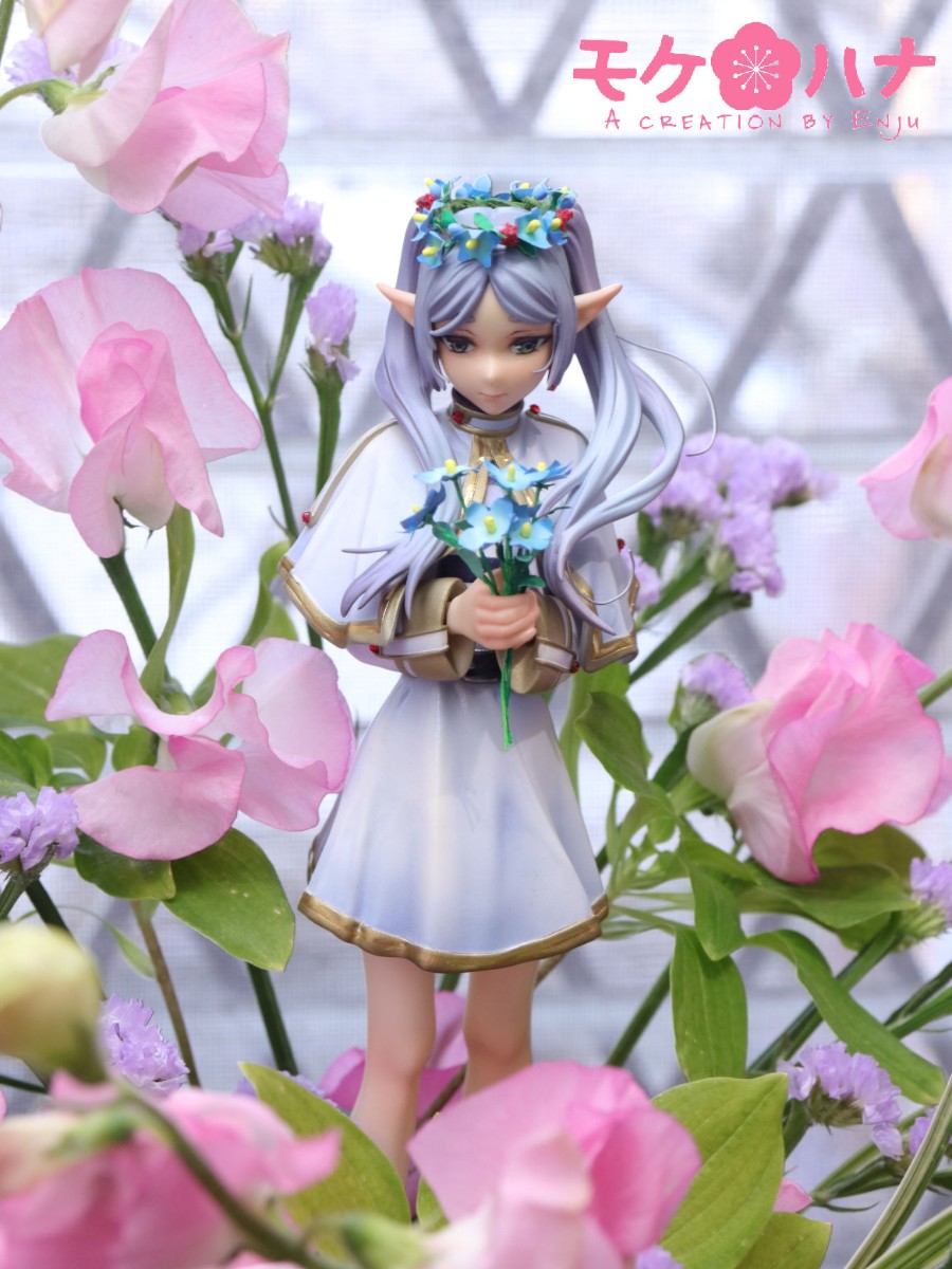 フリーレンは感情が表れにくいキャラですが、幸福感を演出するためパステルカラーの春の花をたっぷり合わせました。