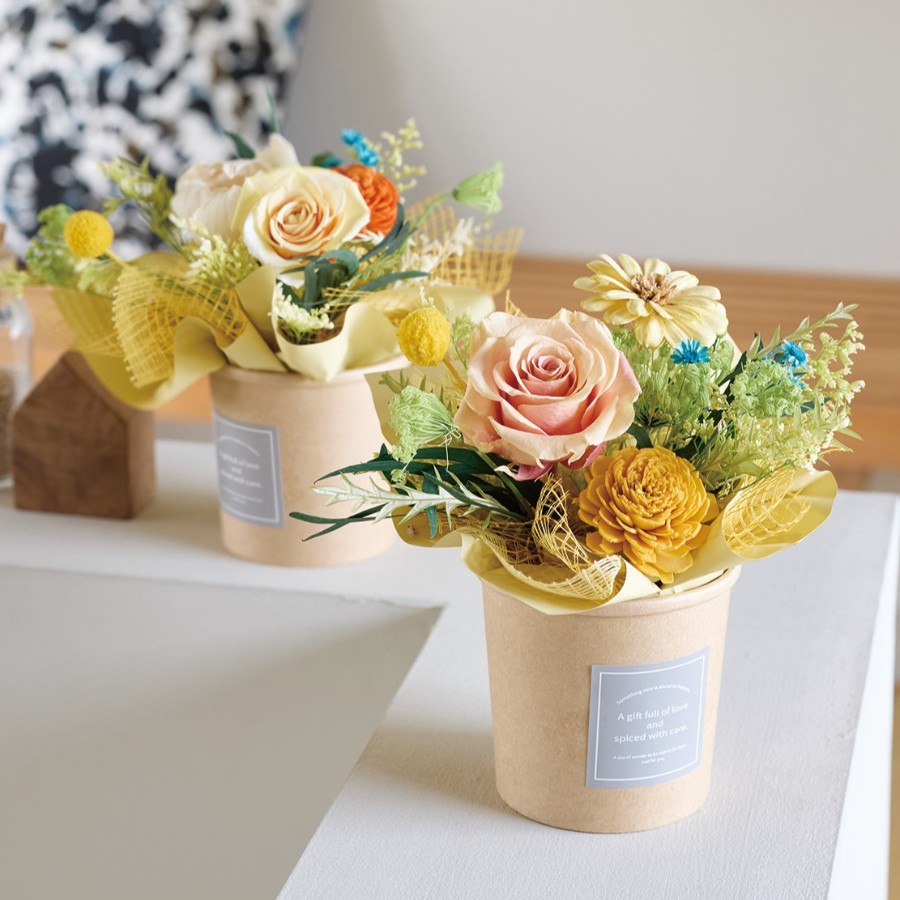 温かな陽だまりを思わせるジュリアローズや、柔らかなイエローを基調としたお花たち。モーニングイエローのマーガレットやレモンイエローのソーラーローズを重ねたビタミンカラーのグラデーションが、何気ない日常のコーナーをパッと明るく、心地よい空間へと変えてくれます。