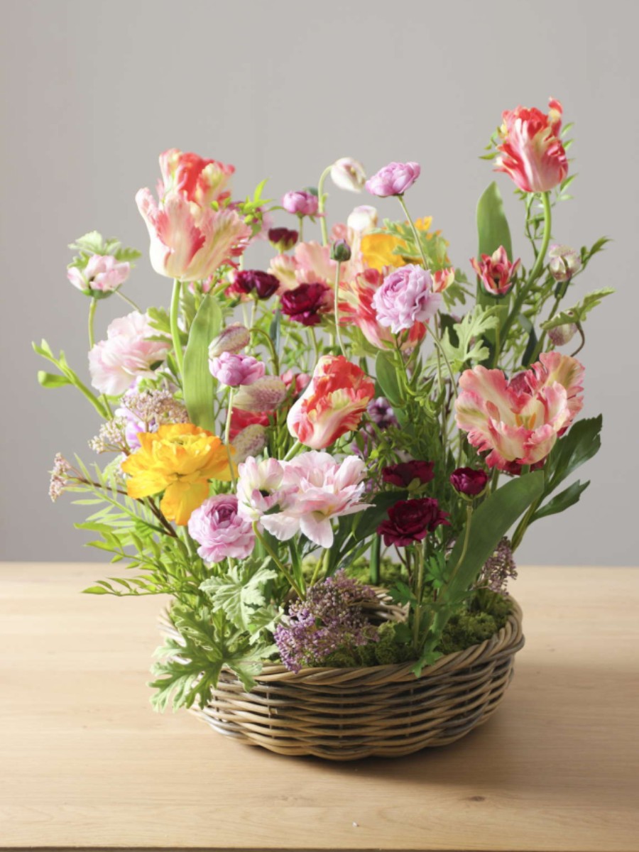 ナチュラルなバスケットにあしらうことで、優しさと温もりを感じる仕上がりに。