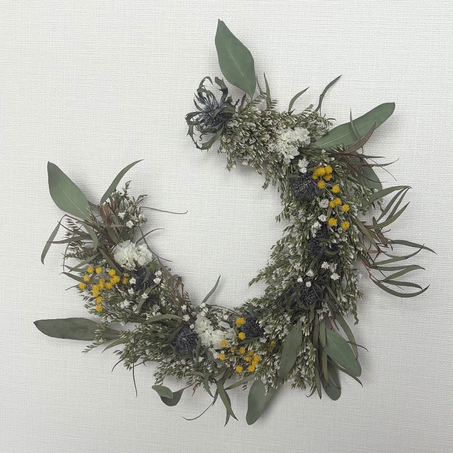 スターチスをベースに、エリンジュームとミモザをアクセントにあしらったクレセント(三日月型)リースです。