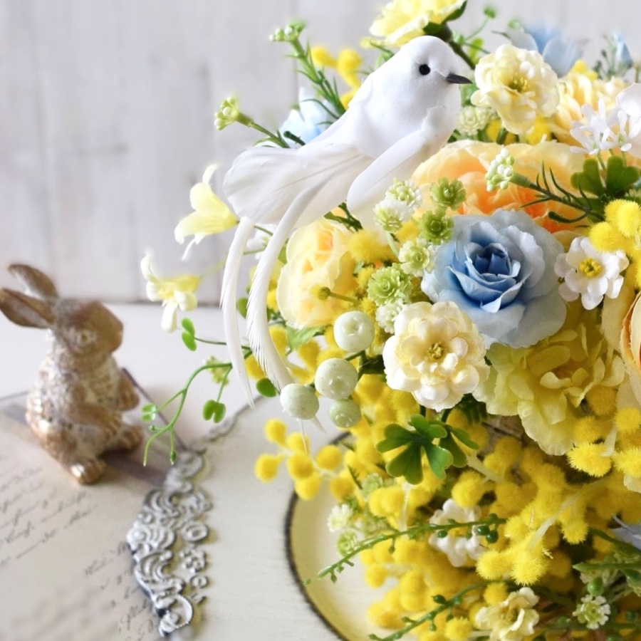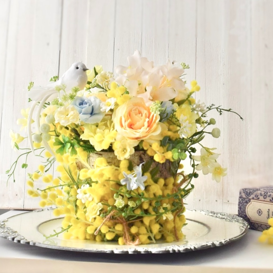 器の周りにもミモザや小花を取り付けて、ミモザでいっぱいにしたところがポイントです。
