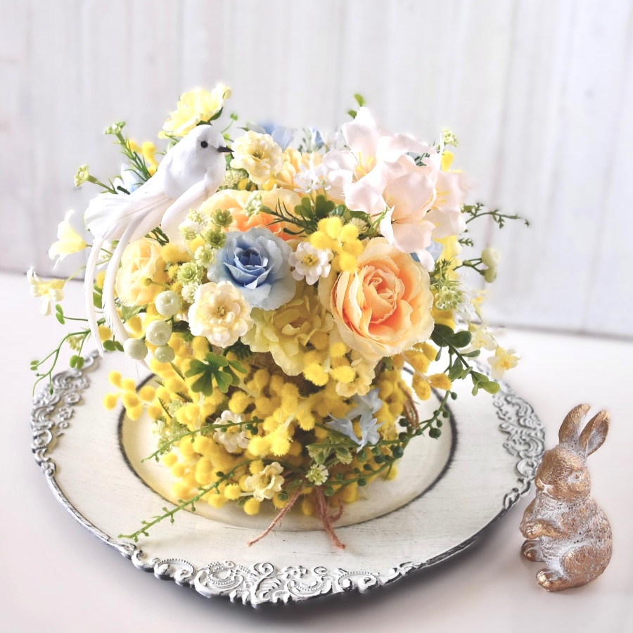 ミモザの温もりあるアレンジメントです。
