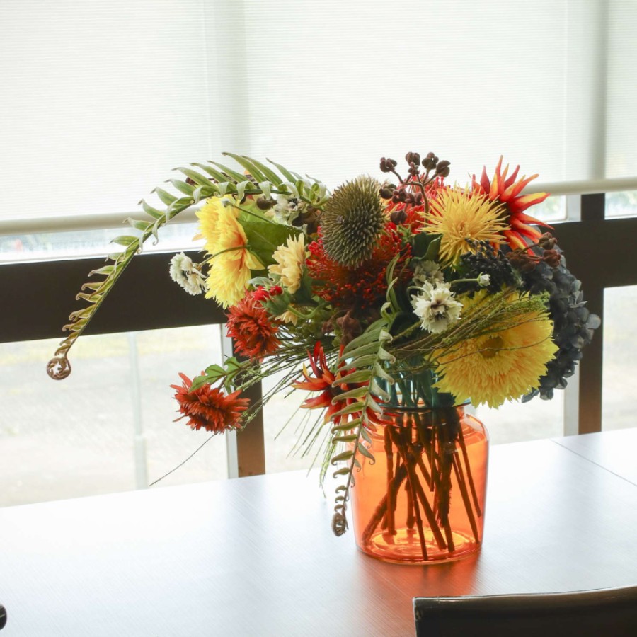動きのあるグリーンや実ものが加わり、自然の息吹を感じる仕上がりに。