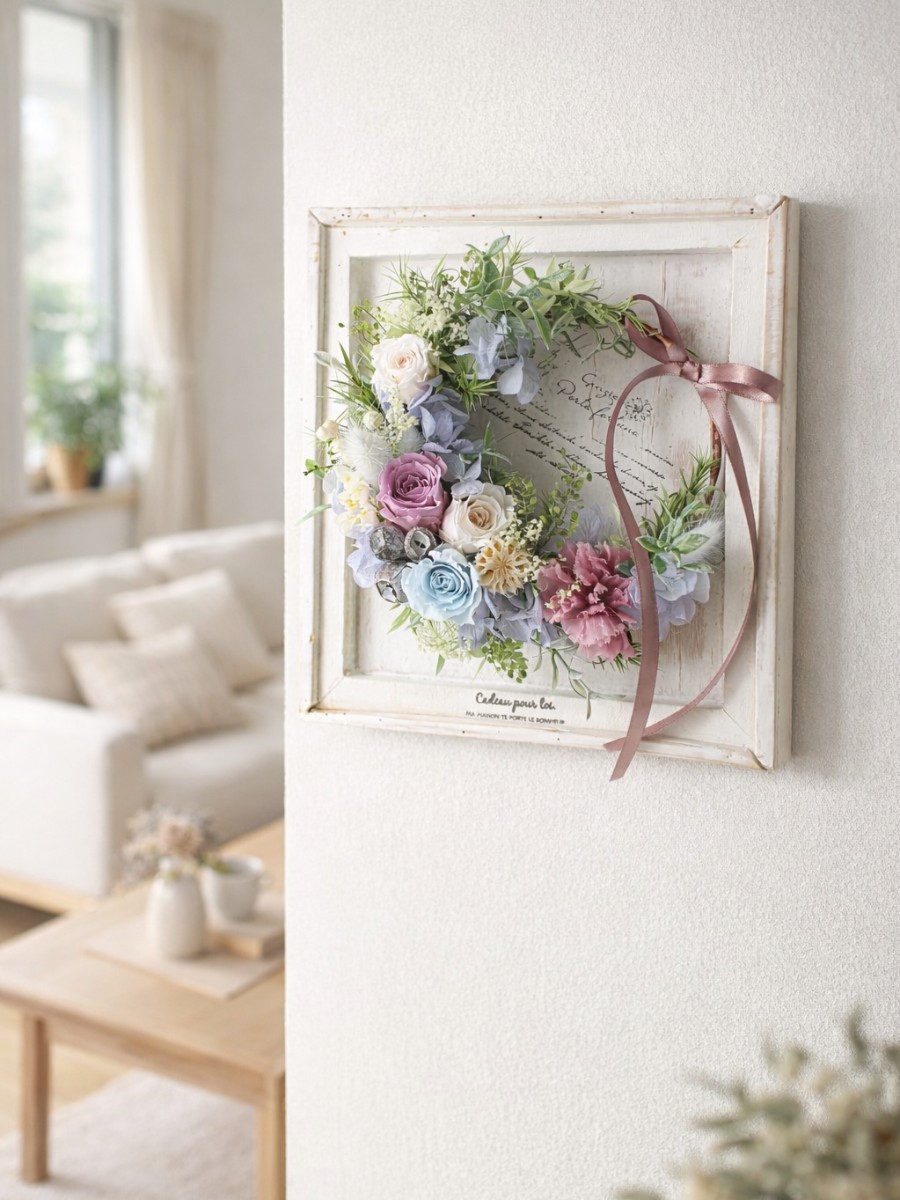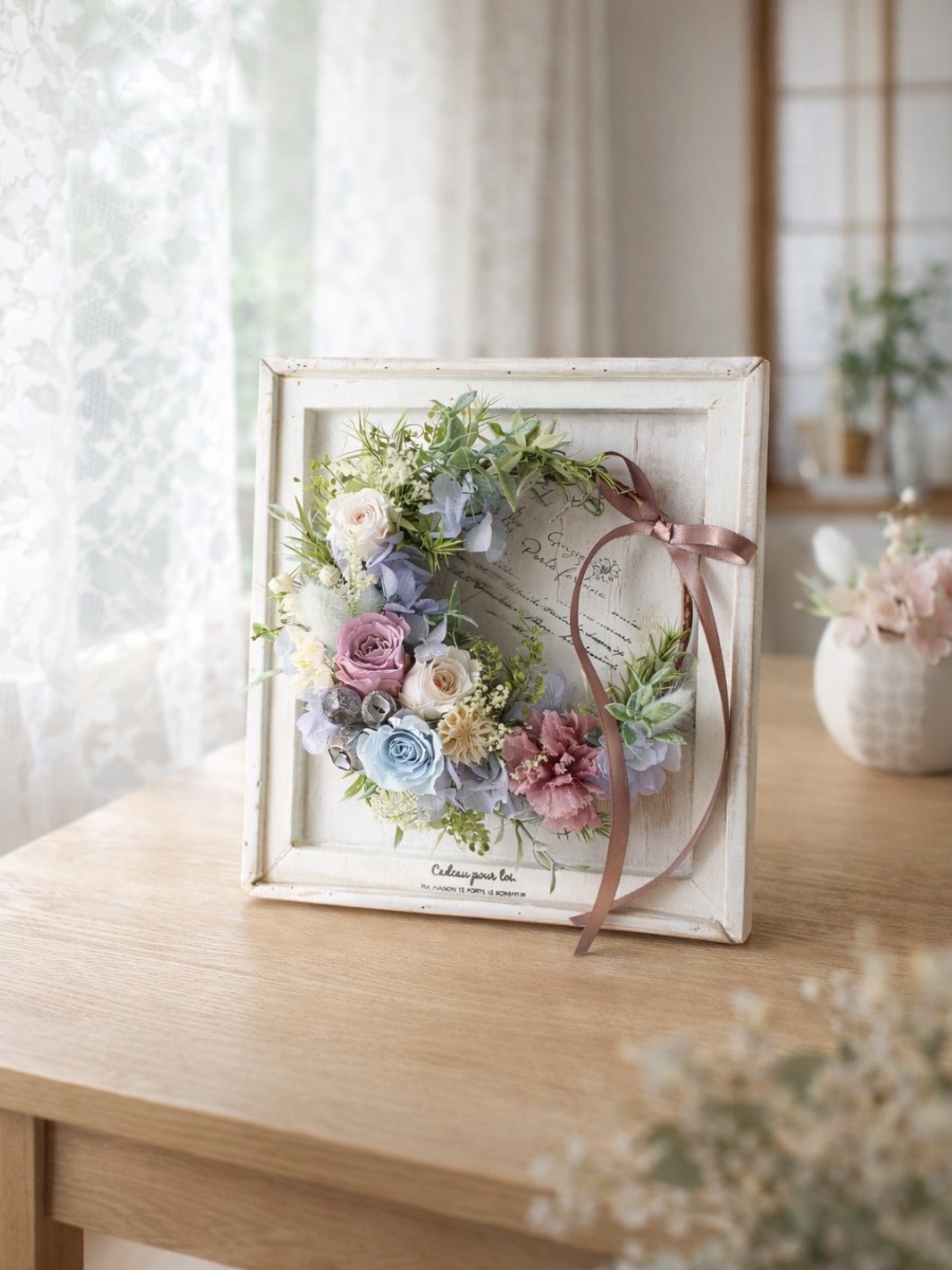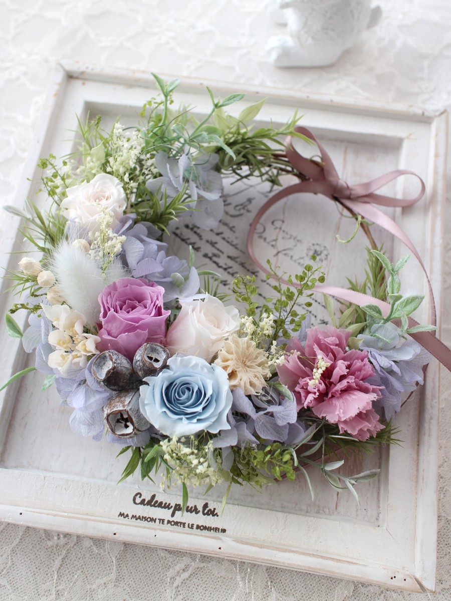 優しい色合わせで制作したハーフリースを、シャビーなフレームに貼り付けました。