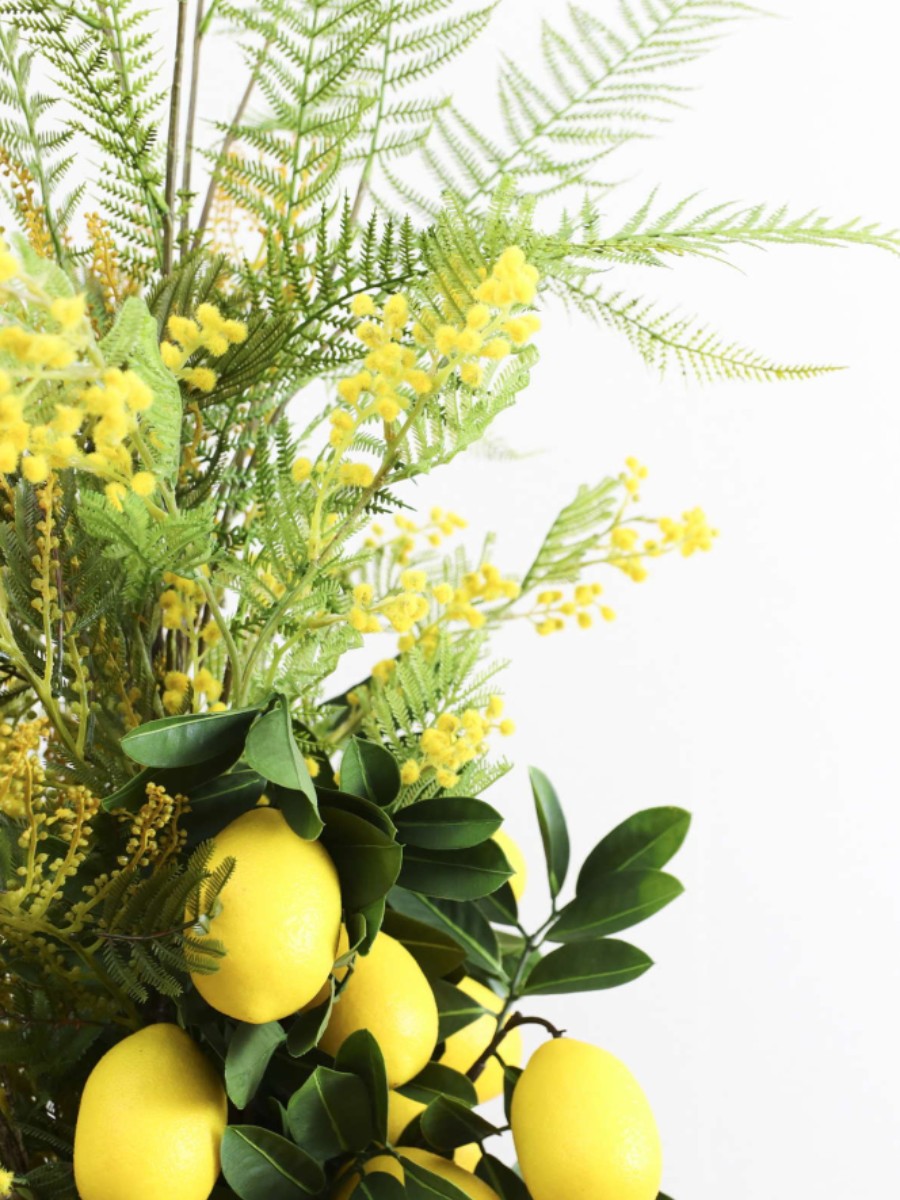鮮やかなミモザと瑞々しいレモンを合わせた、春の息吹を感じるアレンジメント。