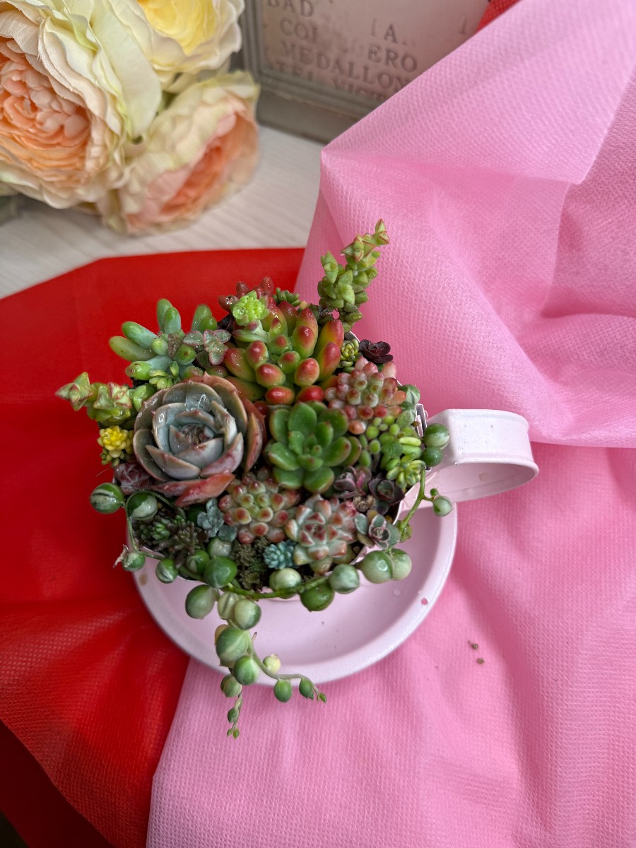 ピンクのブリキ製コーヒーカップを使用した多肉寄せ植えです。