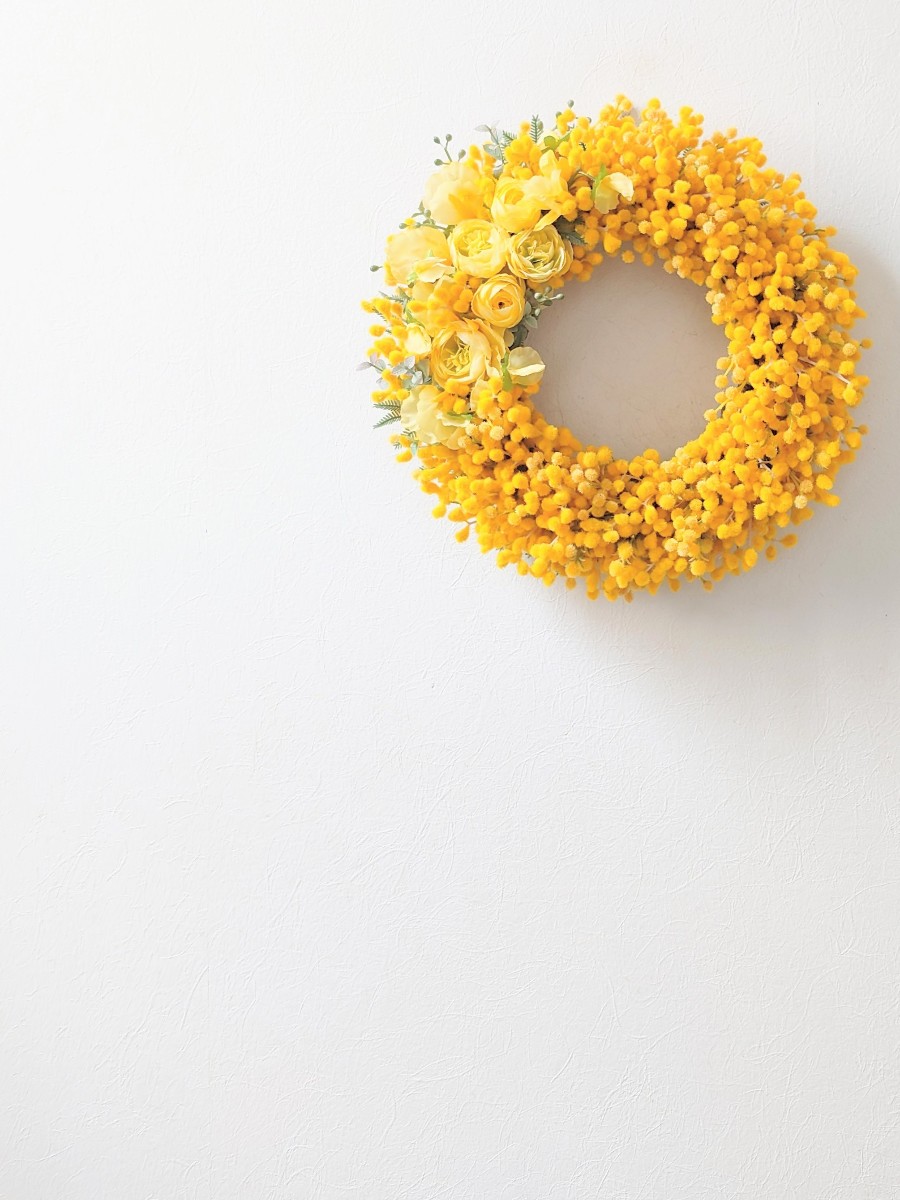 ミモザのお花をふんだんに組んで、黄色が眩しいリースをお作りしました♪