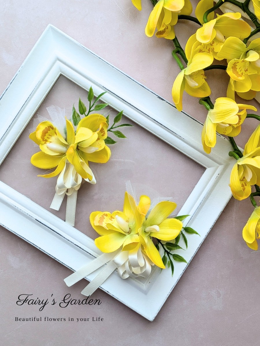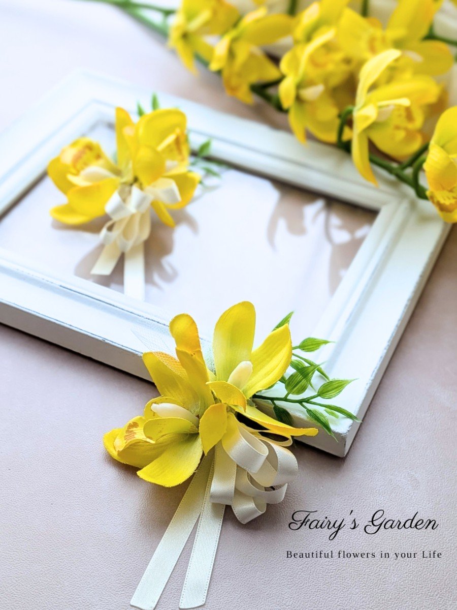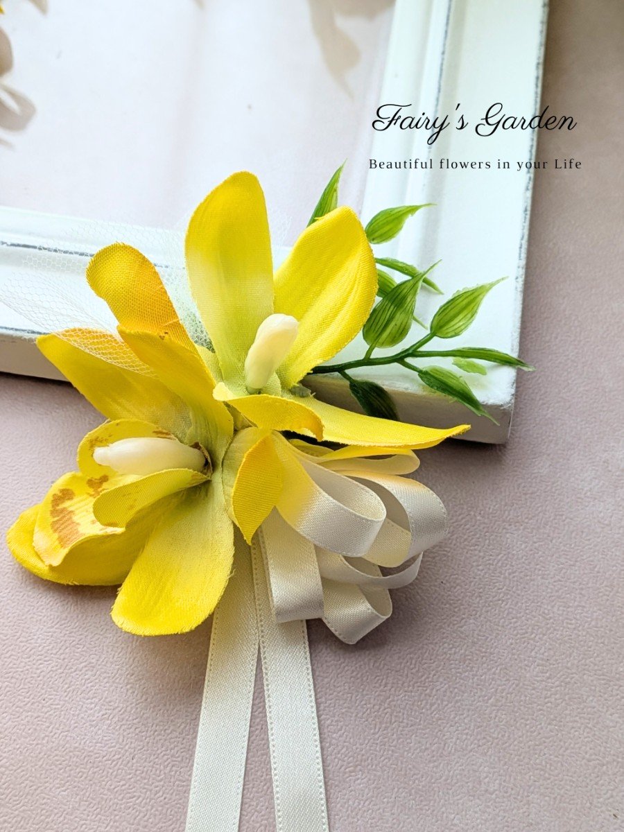 鮮やかな色のシンビジウムをシンプルにまとめた卒業生コサージュ。