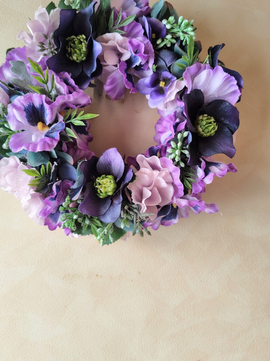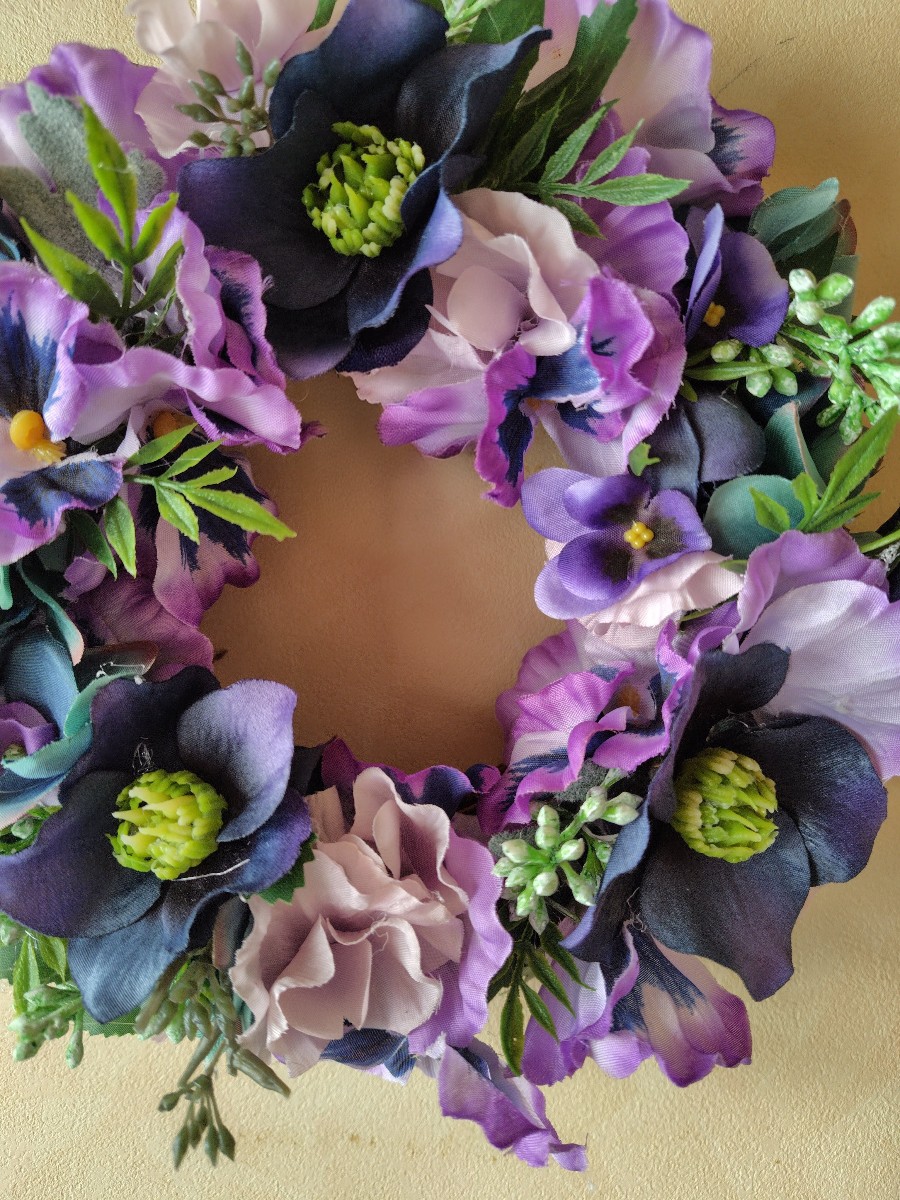 冬の花「パンジー、クリスマスローズ」をメインに作りました。冬の花だけど春がきたみたいに華やかなリースになりました。