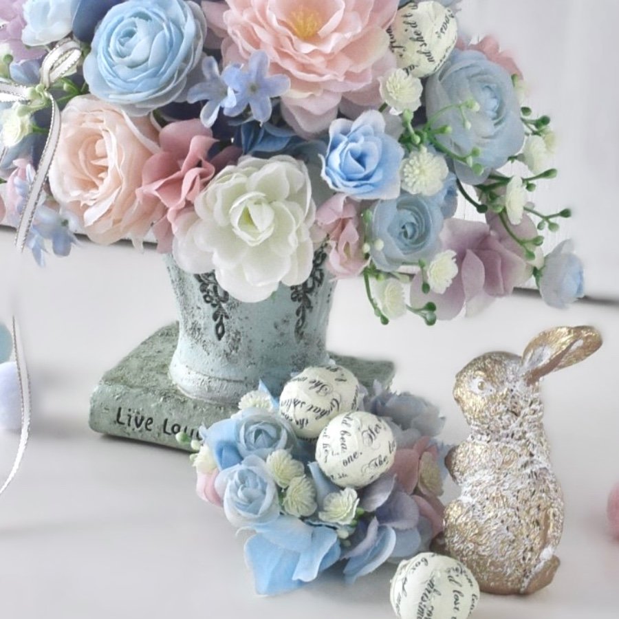小さなリースも作り英字エッグをのせてそっと添えました。