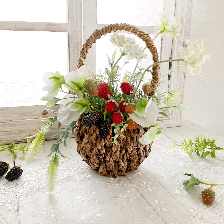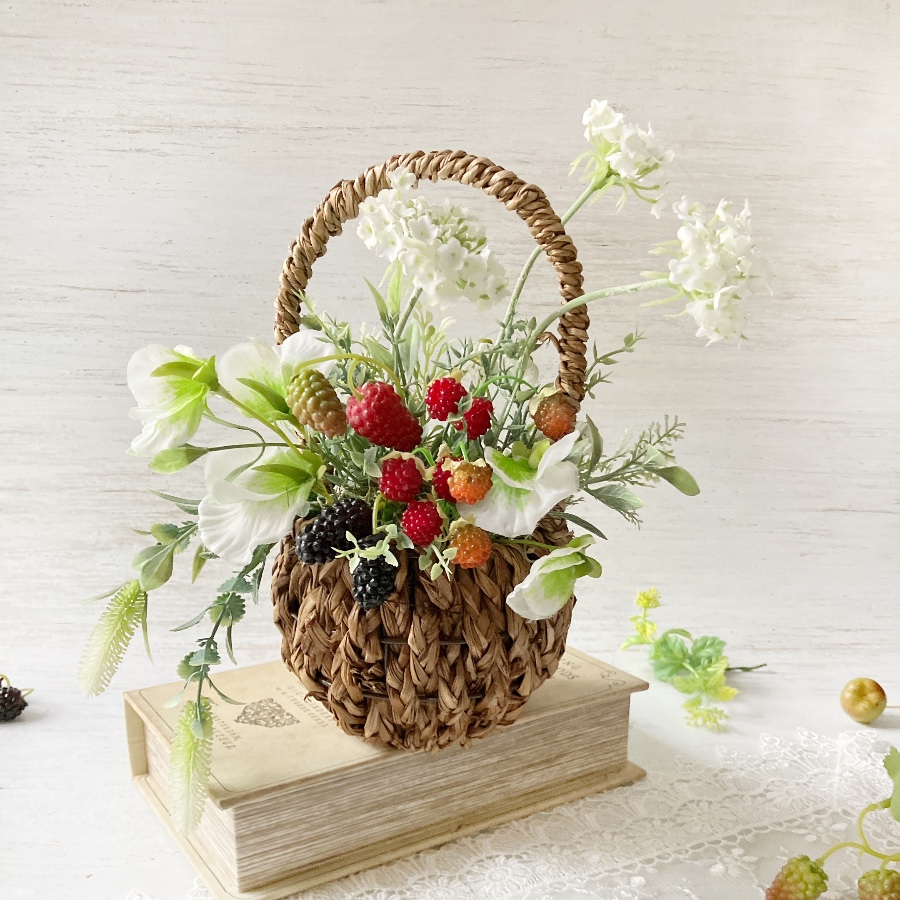 ふわっとしたスイートピーと、揺れるラズベリーやハーブを入れた春のバスケットです。