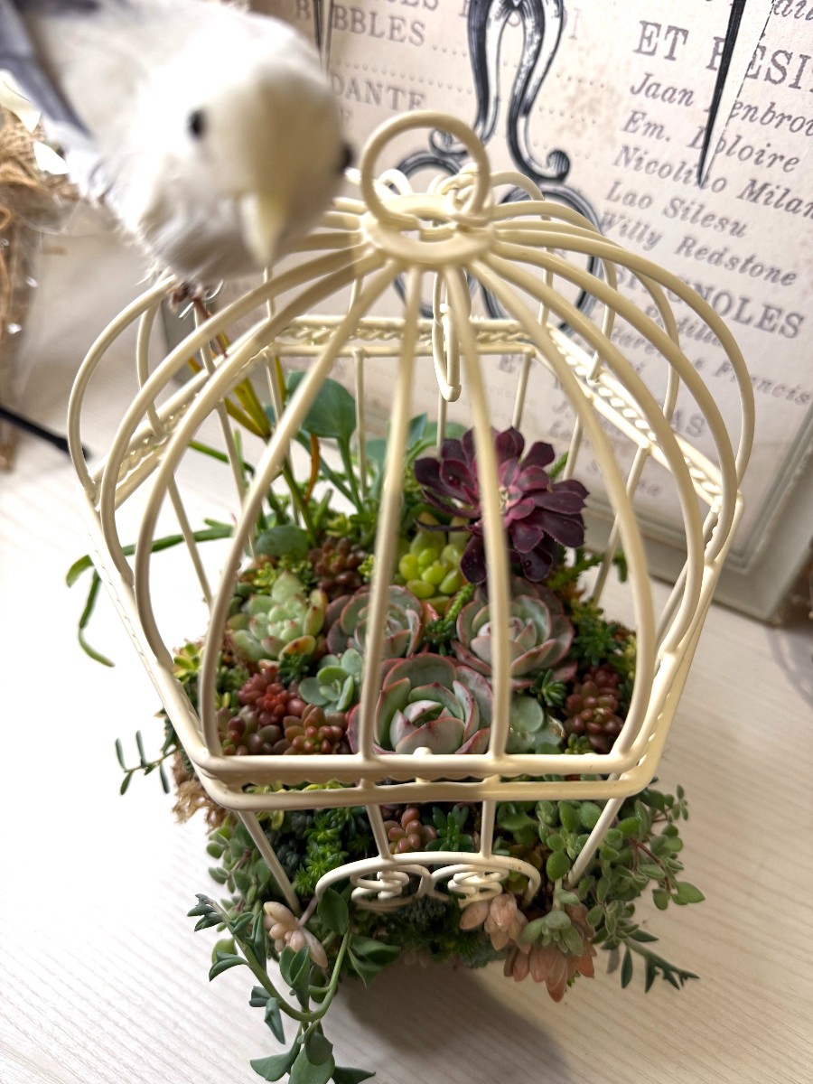 小さな鳥かごの中に、ぎゅっと詰め込んだ多肉の森。