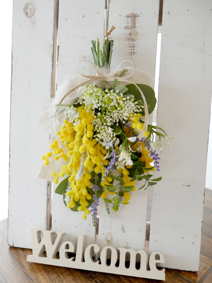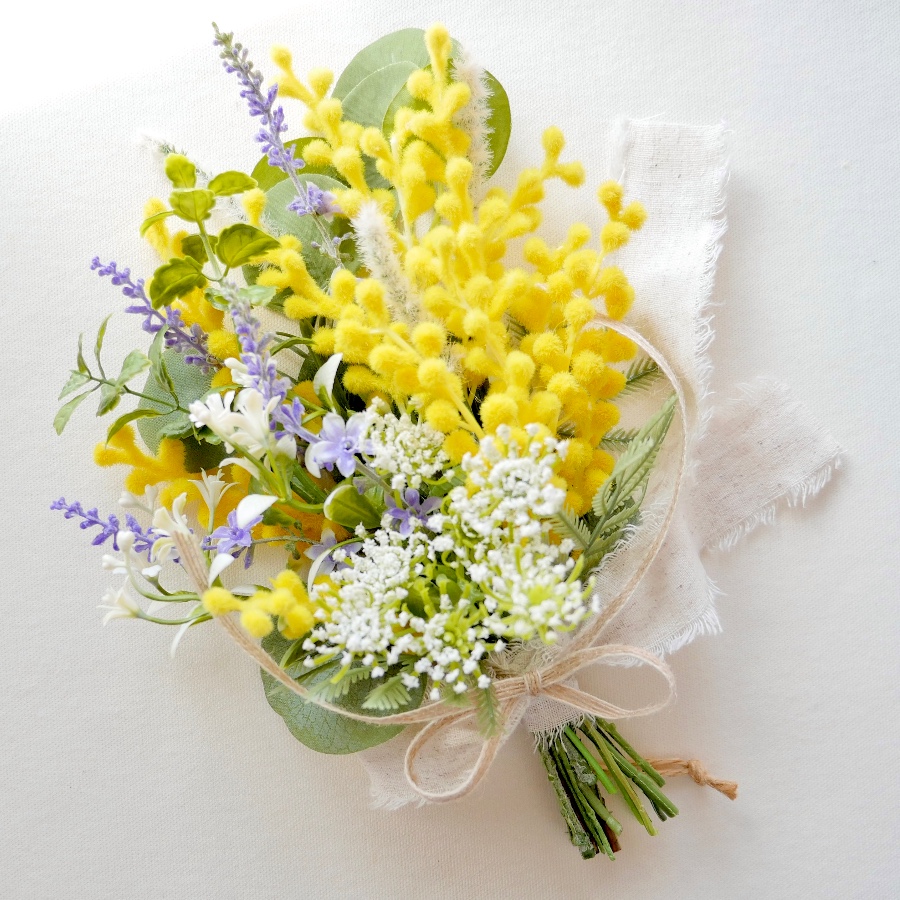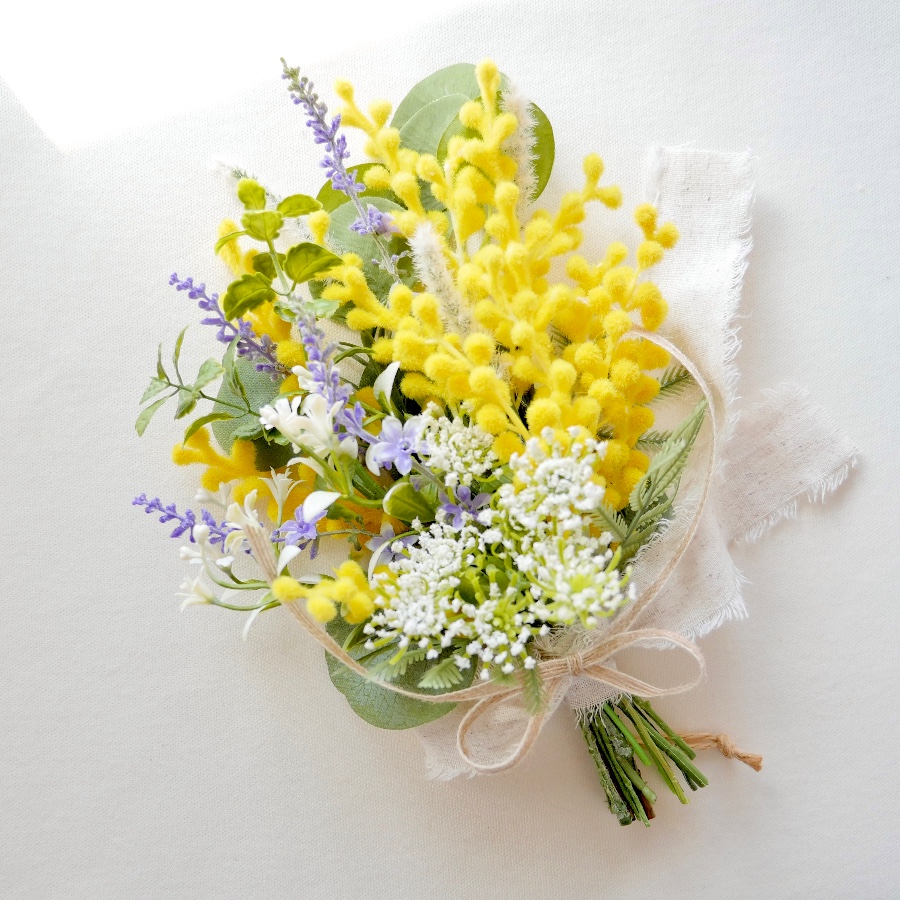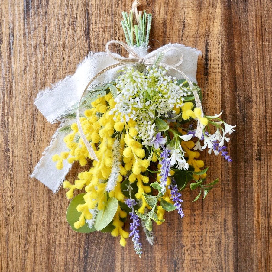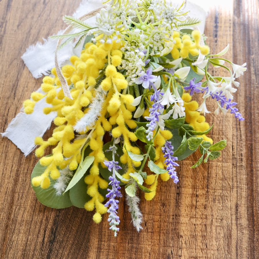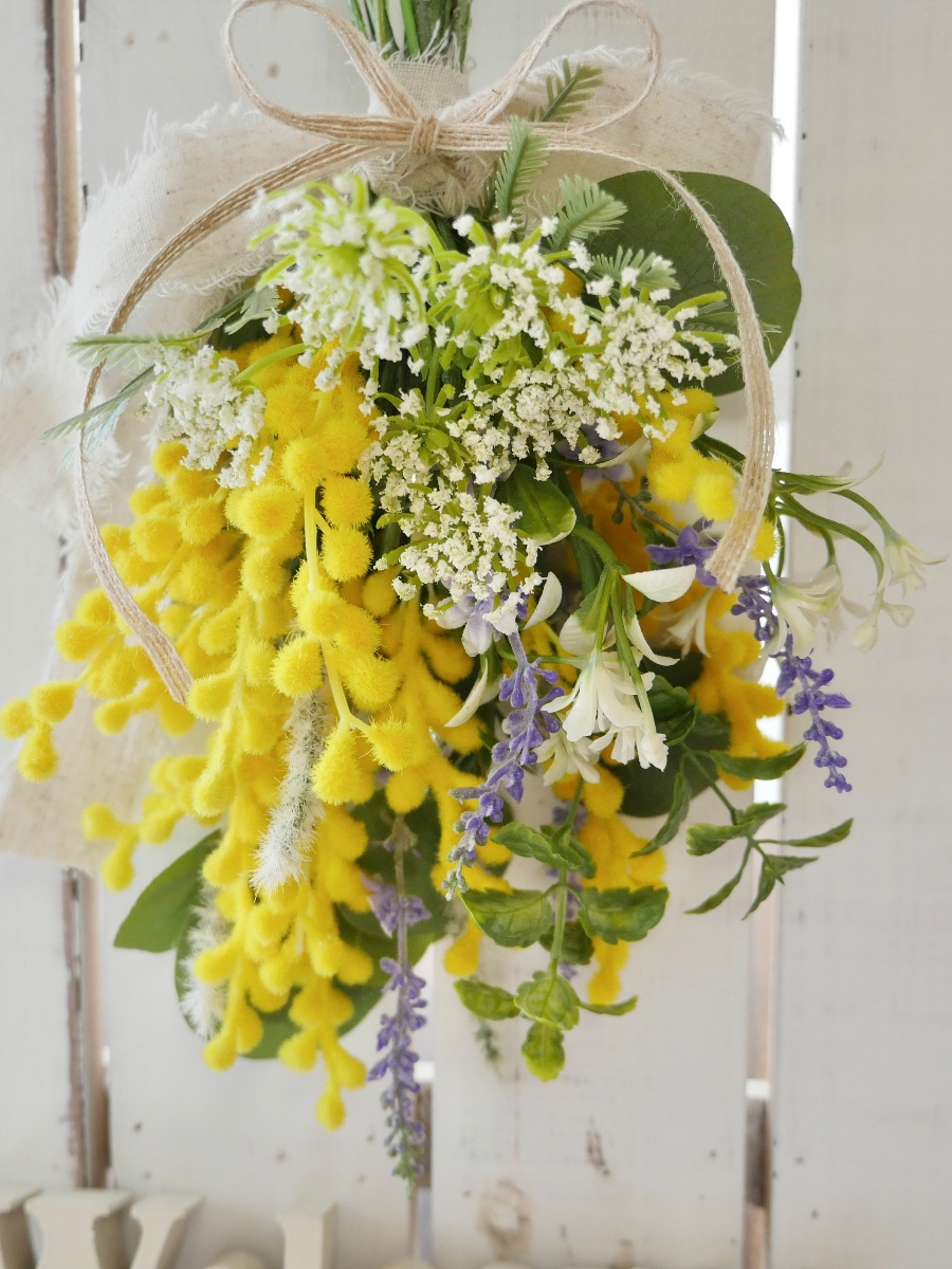 ふわふわミモザを主役にナチュラルな花材の組み合わせ。