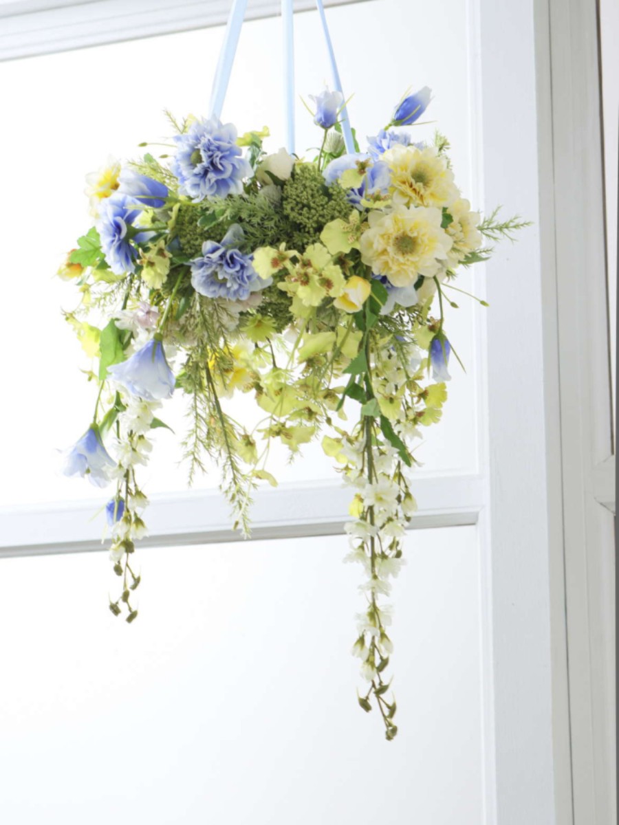 空間に浮かぶように吊るされた花々が、光を受けてやさしく揺れ、まるで春の風をまとっているかのような印象を与えます。