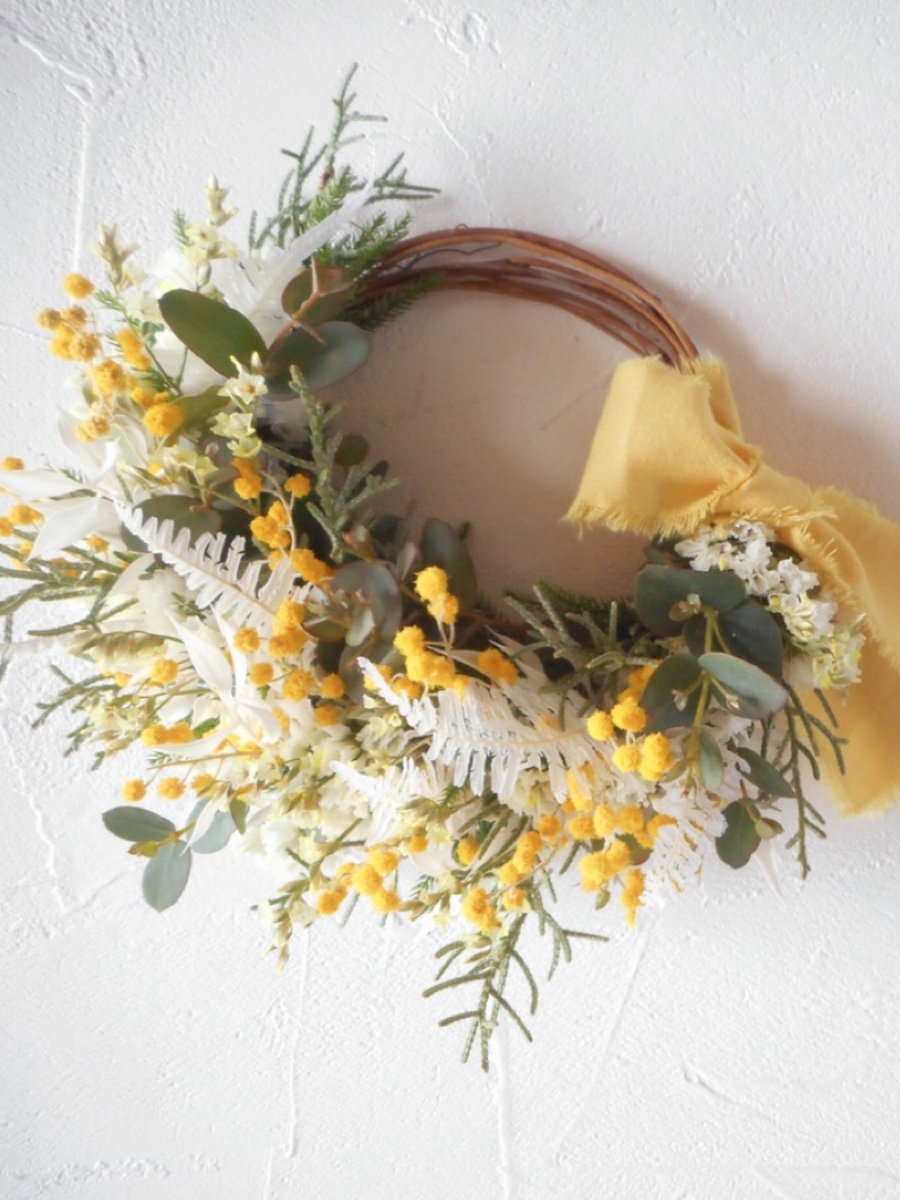 グリーン×ホワイトをベースとしたリースにミモザをアクセントに。ミモザのかわいさよりもナチュラルさを引き出したリースです
