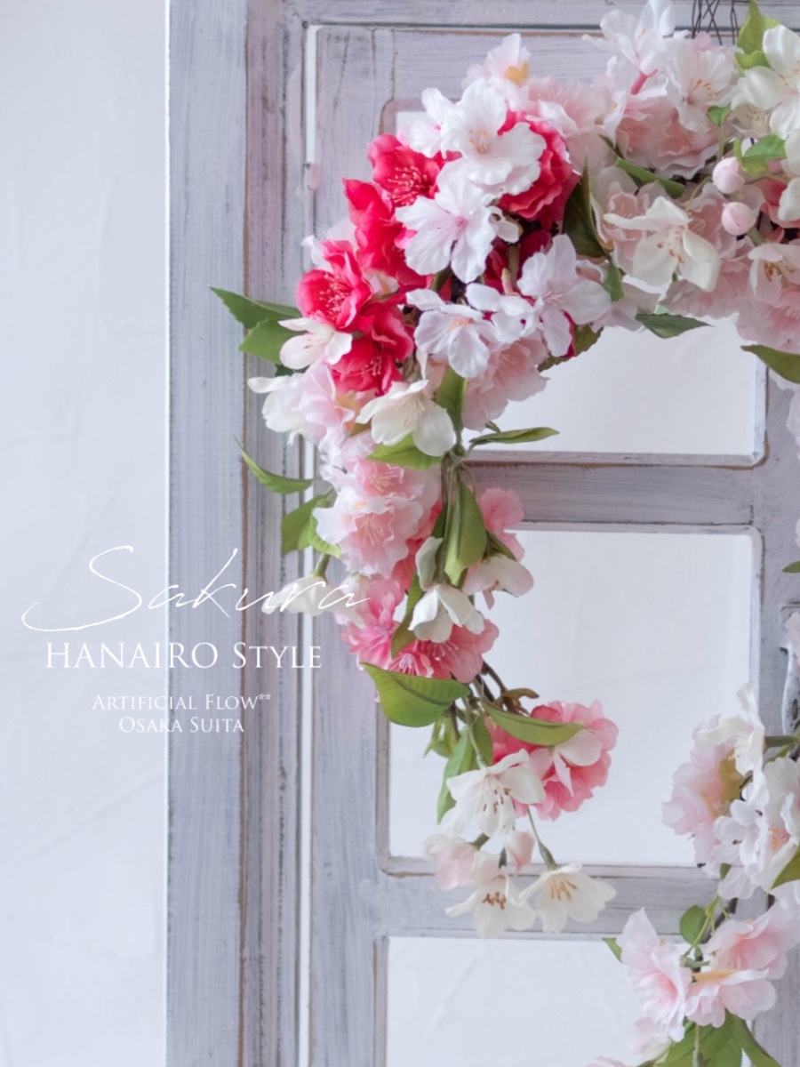 桜をふんだんに使った贅沢なホースシュー(馬蹄形)リースです。