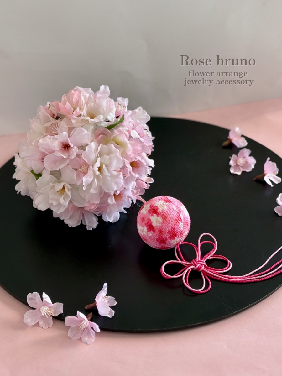 薄いピンクの桜と濃いピンクのちりめん柄ボール&梅結び紐をプラスして、柔らかさと華やかさ、落ち着きのある上品さを表現しています(*˘︶˘*).。*♡