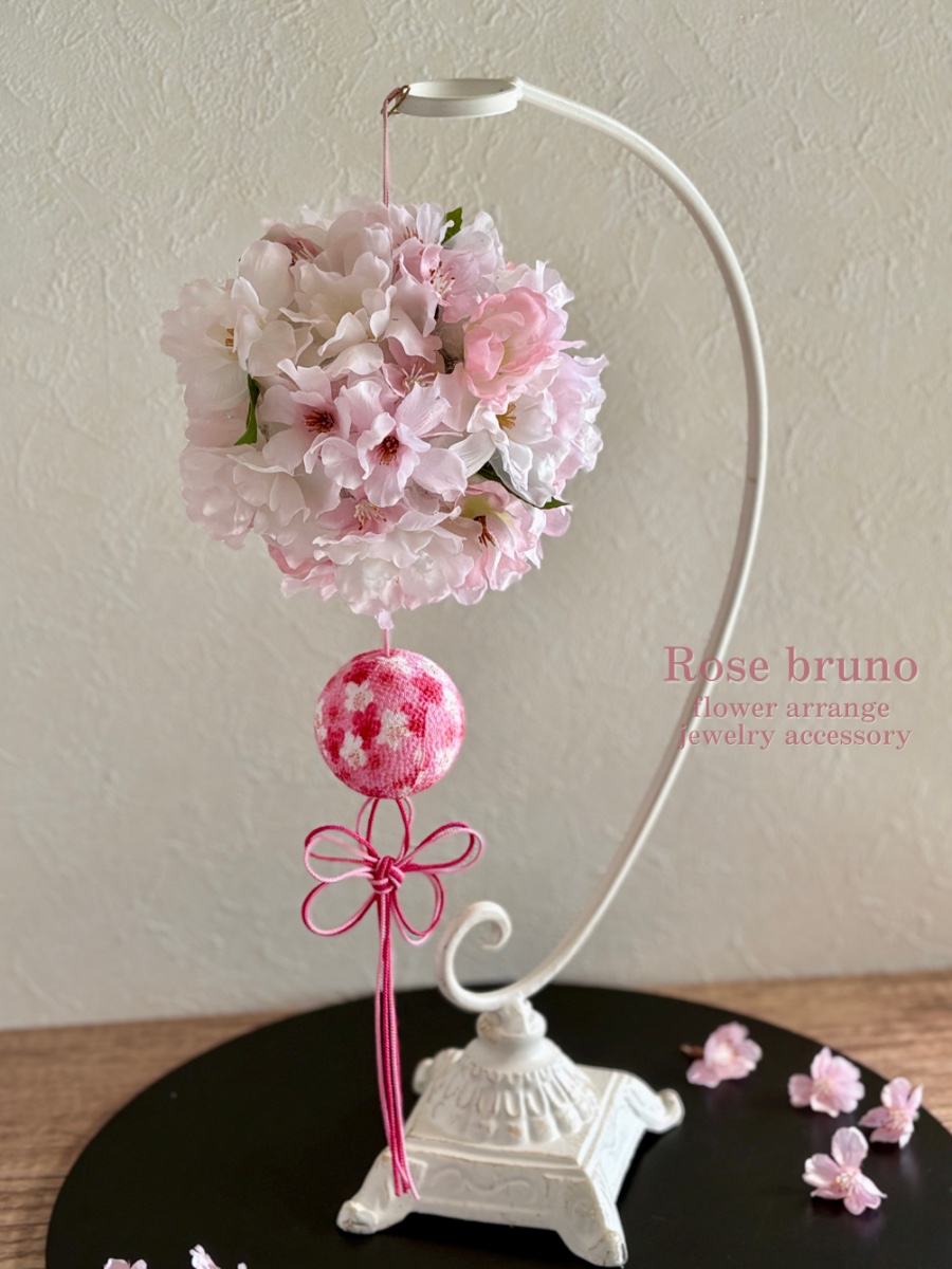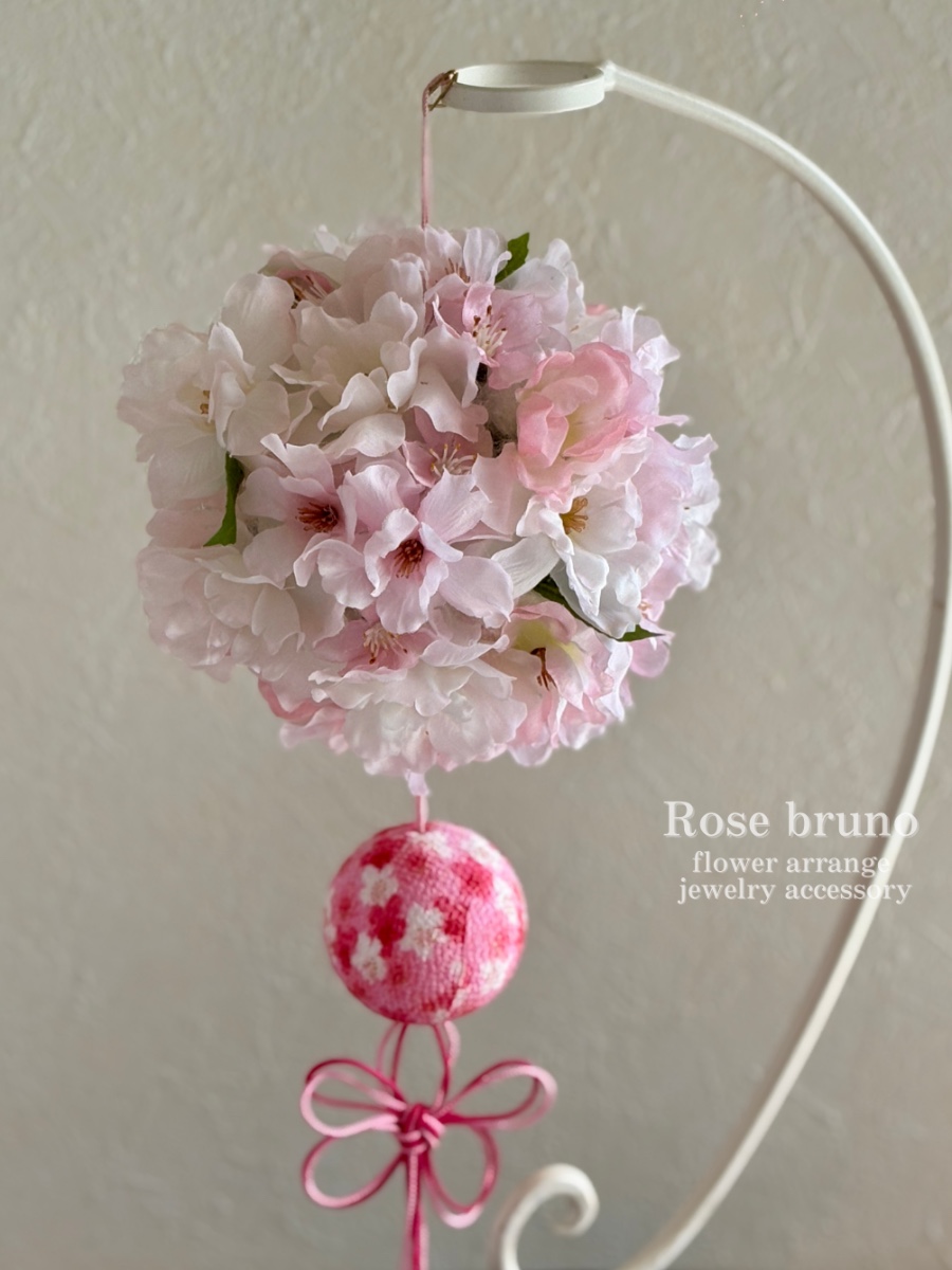 ふわふわで優しい印象の八重桜を可愛く丸まるボールに吊るし飾りデザインでアレンジしました♪