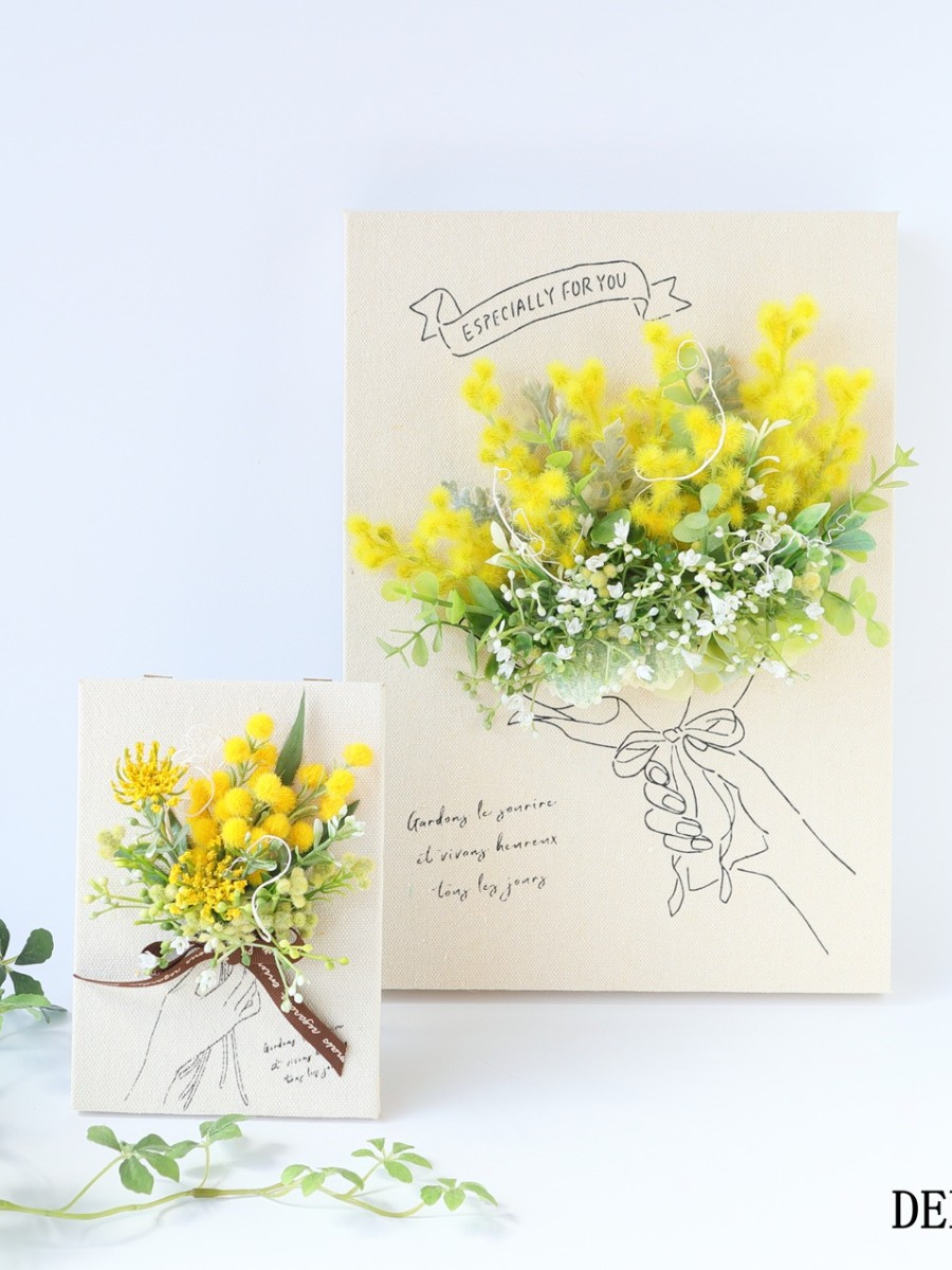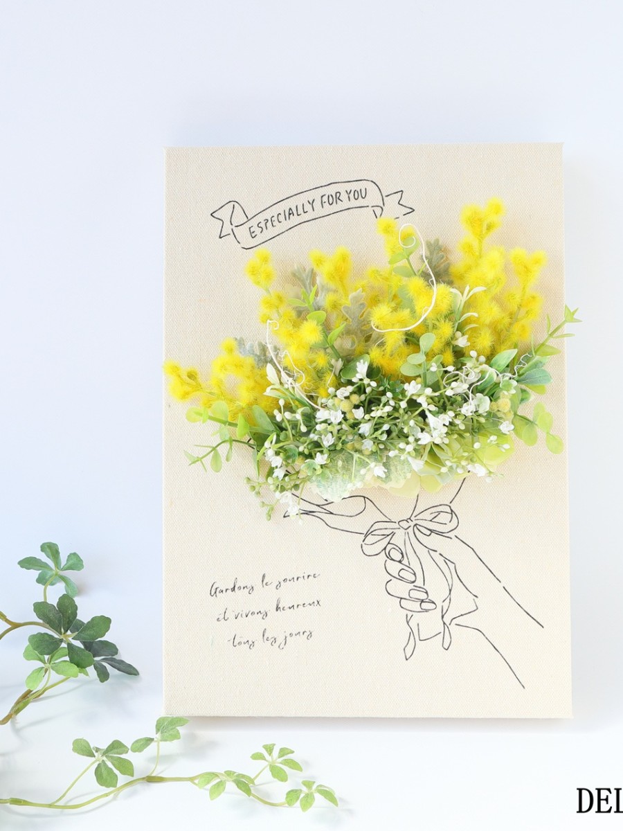 アーティフィシャルフラワーのミモザやカスミソウを使用したキャンバスボードアレンジです。