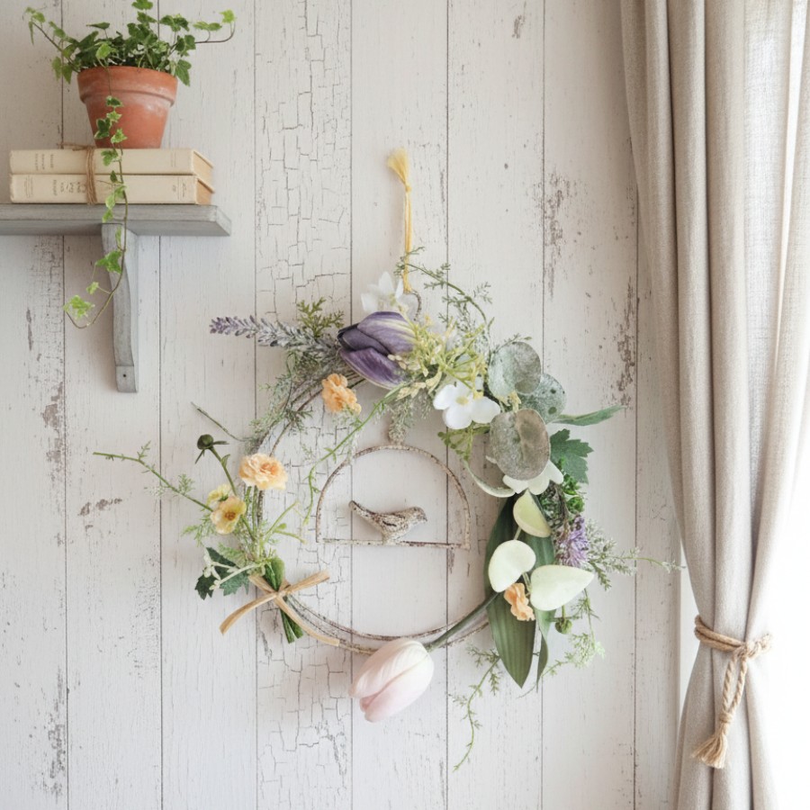 まるで春の庭をそのまま切り取ったような物語を感じるリースを作ります。
