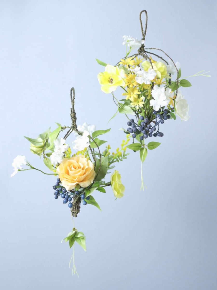 円を描くフォルムが空間にやさしい動きを生み、壁面に飾るだけで立体的なアクセントに。可憐な白花と深みのあるベリーカラーがほどよいコントラストとなり、甘さの中に洗練された雰囲気を感じさせます。