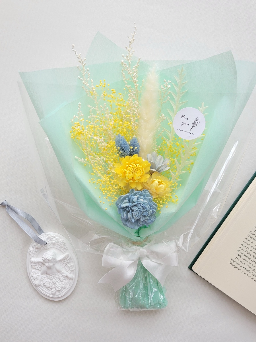 爽やかなミントカラーのラッピングがキュートな花束。卒業や入学、お世話ななった方へのプレゼントに最適です。