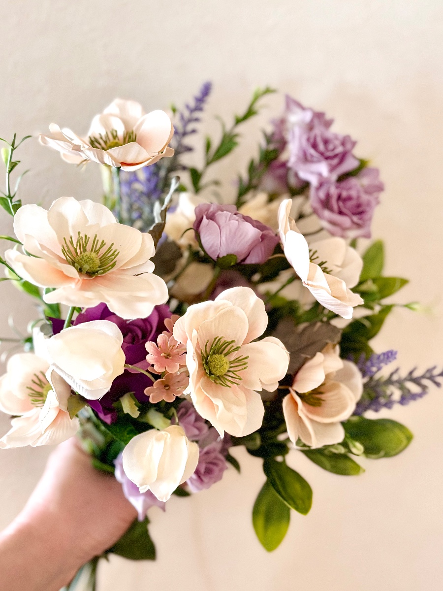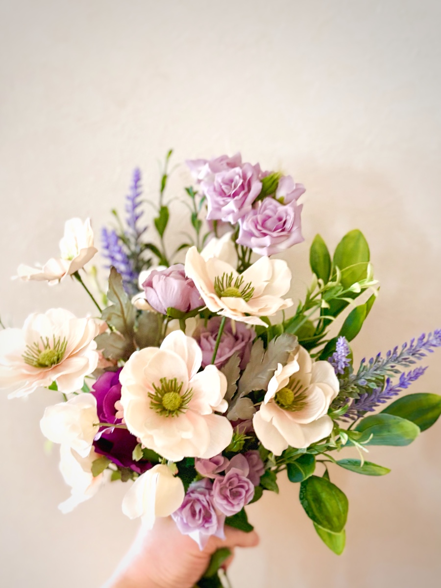 紫色のローズとアネモネを合わせた、アーティフィシャルフラワー使用、春スタイルのブーケです。贈り物に最適。