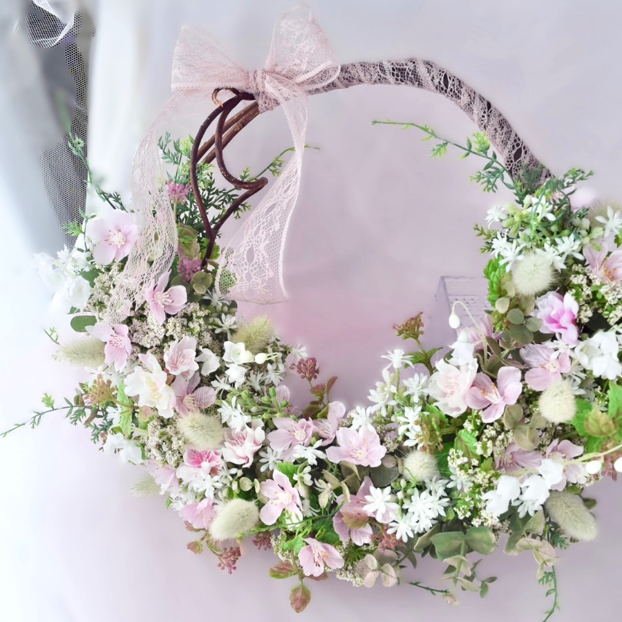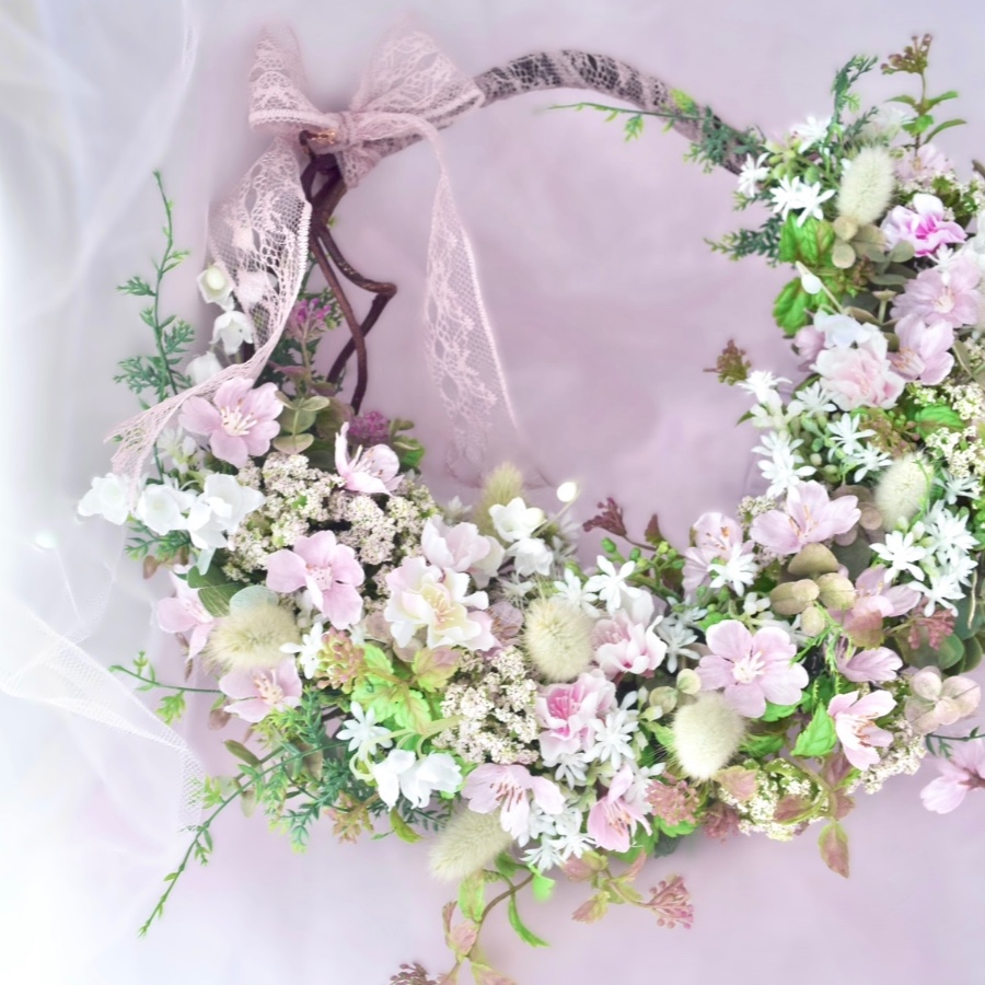 桜の可憐さ、小花の星型やベル型、リーフの伸びやかさなどをいかしました。